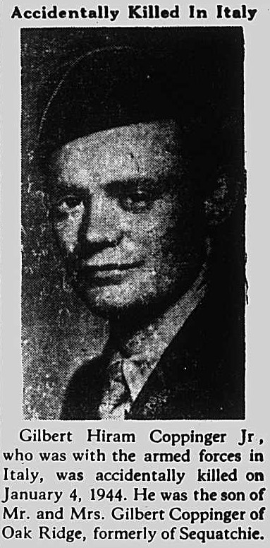 Gilbert Hiram Coppinger, Jr., who was with the armed forces in Italy, was accidentally killed on January 4, 1944. He was the son of Mr. and Mrs. Gilbert Coppinger of Oak Ridge, formerly of Sequatchie.