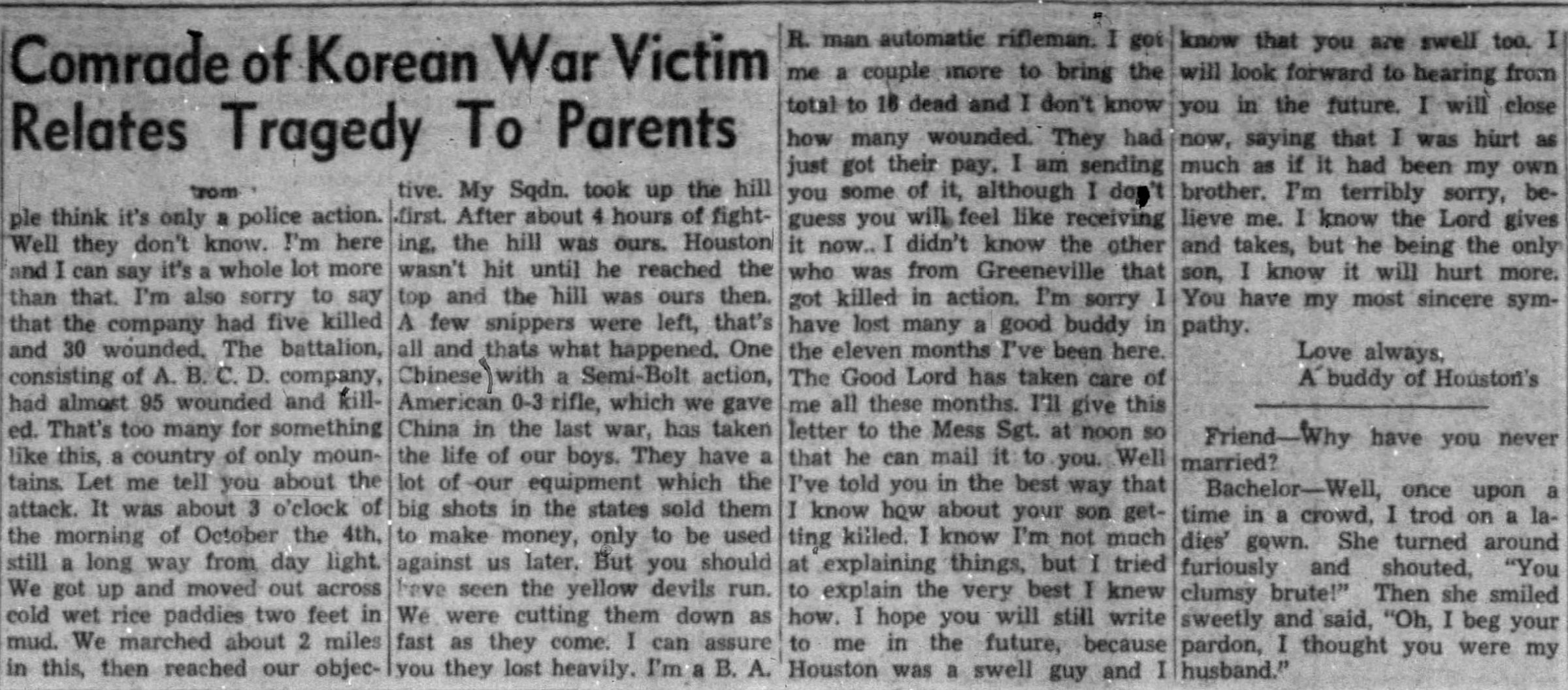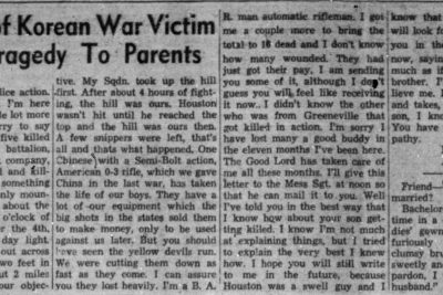 I don’t know how to begin or what to say to explain what I have to. I promised you I would write to you. It’s about your son Houston, if you haven’t already heard from the War Department. He was killed in action October 4th, 1951 while taking Objective Hill 281. He didn’t suffer, I can assure of that. He was hit in the head and it was all over. The only thing I can say is that all of you should be proud of him and try not to worry or be sorry. I know that is the way he would want you to feel. He was a swell guy, I know, I’ve been with him ever since he has been here, and if the rest of the guys back home were like him and would come over and do their part, America would be a lot better today. Houston gave all he could. His life, for his Country, is there any more for us to give? If we weren’t here, someone else would be. Most people think it’s only a police action. Well they don’t know. I’m here and I can say it’s a whole lot more than that. I’m also sorry to say that the company had five killed and 30 wounded. The battalion, consisting of A.b.C.D. company, had almost 95 wounded and killed. That’s too many for something like this, a country of only Mountains. Let me tell you about the attack. It was about o’clock of the morning of October theth, still a long way from day light. We got up and moved out across cold wet rice paddies two feet in mud. We marched about 2 miles in this, then reached our objective. My Sqdn. Took up the hill first. Aftera bout hours of fighting, the hill was ours. Houston wasn’t hit until he reached the top and the hill was ours then. A few snippers were left, that’s all and thats what happened. One Chinese with a Semi-Bolt action, American – rifle, which we gave China in the last was, has taken the life of our boys. They have a lot of our equipment which the big shots in the states sold them to make money, only to be used againt us later. But you should have seen the yellow devils run. We were cutting them down as fast as they come. I can assure you they lost heavily. I’m a B.A.R. man automatic rifleman. I got me a couple more to bring the Total to 16 dead and I don’t know how many wounded. They had just got their pay. I am sending you some of it, although I don’t guess you will feel like receiving it now. I didn’t know the other who was from Greeneville that got killed in action. I’m sorry I have lost many a good buddy in the eleven months I’ve been here. The Good Lord has taken care of me all these months. I’ll give this letter to the Mess Sgt. at noon so that he can mail it to you. Well I’ve told you in the best way that I know how about your son getting killed. I know I’m not much at explaining things, but I tried to explain the very best I knew how. I hope you will still write to me in the future, because Houston was a swell guy and I know that you are swell too. I will look forward to hearing from you in the future. I will close now, saying that I was hurt as much as i fit had beern my own brother. I’m terribly sorry, believe me. I know the Lord gives and takes, but he being the only son, I know it will hurt mroe. You have my most sincere sympathy.