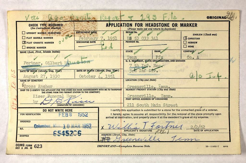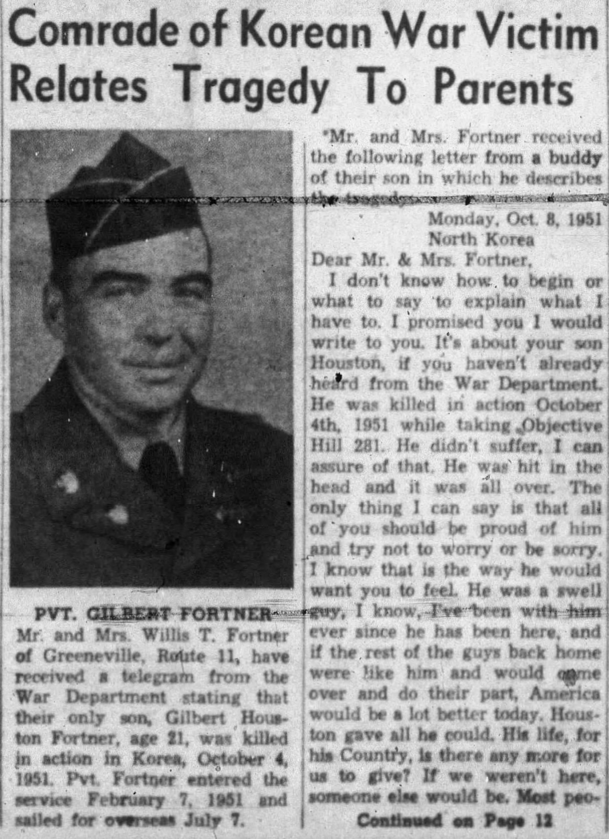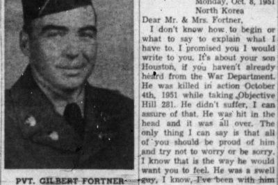 Mr. and Mrs. Willis T. Fortner of Greeneville, Route 11, have received a telegram from the War Department stating that their only son, Gilbert Houston Fortner, age 21, was killed in action in Korea, October 4, 11951. Pvt. Fortner entered the service February 7, 1951 and sailed for overseas July 7. Mr. and Mrs. Fortner received the following letter from a buddy of their son in which he described the tragedy.