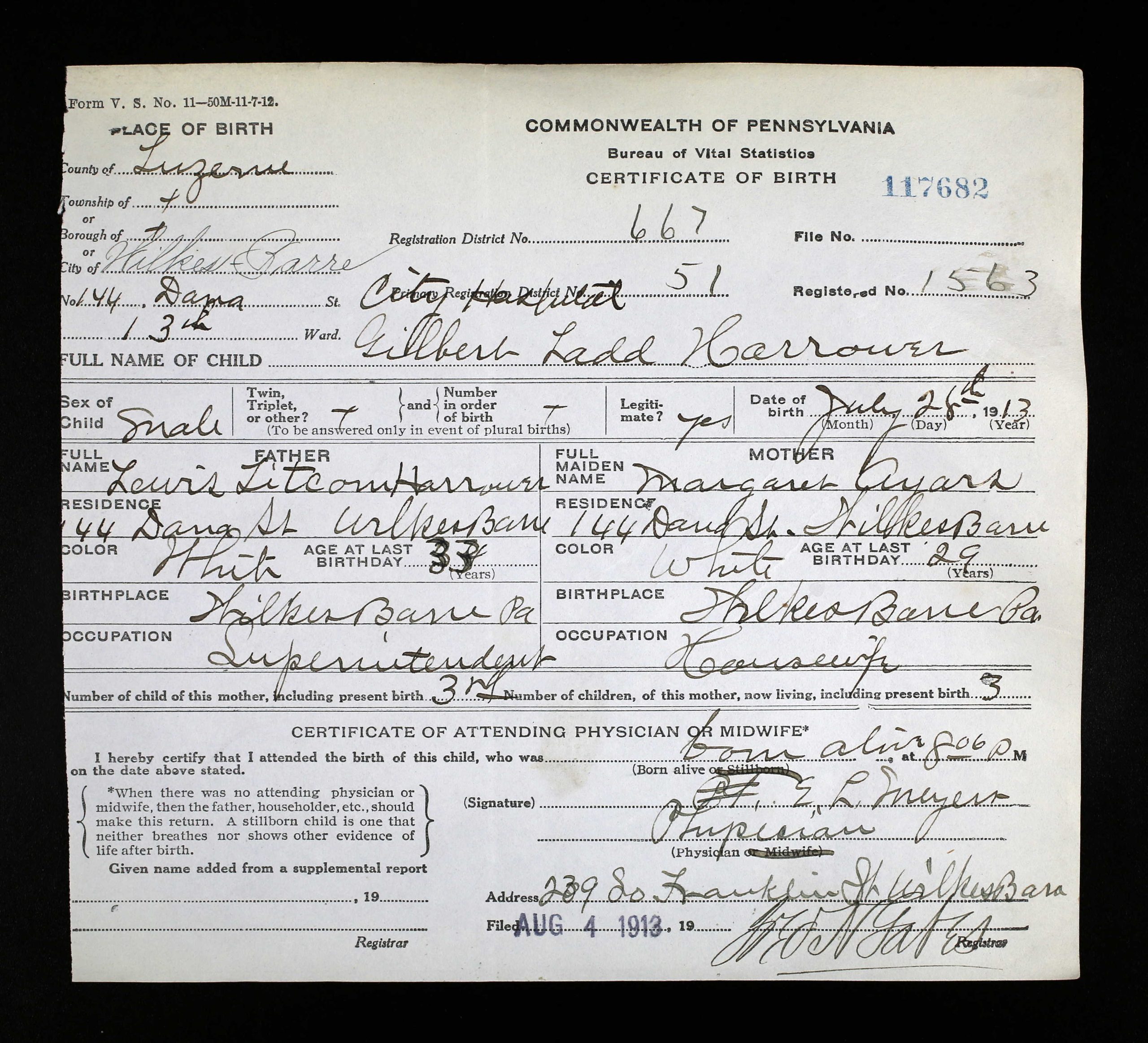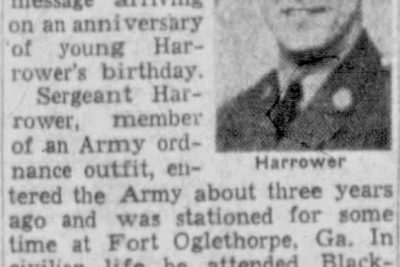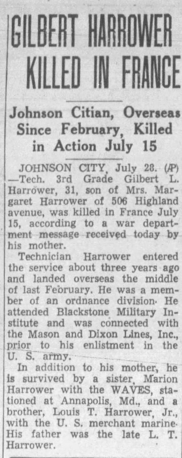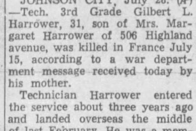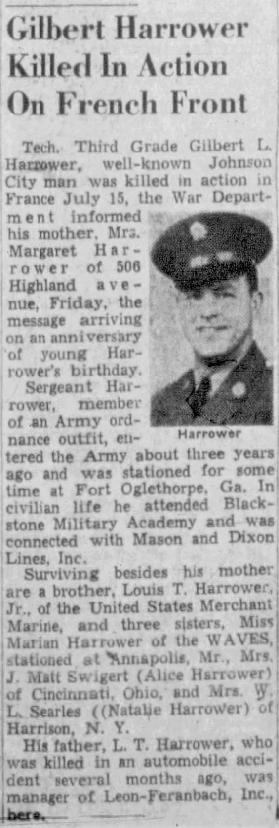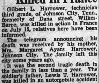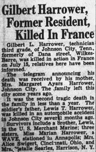 Gilbert L. Harrower, technician third grade, of Johnson City, Tenn., formerly of Dana street, Wilkes-Barre, was killed in action in France on July 15, relatives here have been informed. The telegram announcing his death was received by his mother, Mrs. Margaret Ayars Harrower, Johnson City. The family left this city some years ago. It was the second tragic death in the family in less than a year. The soldier’s father, Lewis T. Harrower, was killed in an automobile accident in Johnson City several months ago. Survivors include a brother, Lewis, in the U.S. Merchant Marine; three sisters, Miss Marian Harrower, a WAVE stationed in Annapolis; Mrs. Alice Swigert, Cincinnati, Ohio, and Mrs. Natalie Searles, Harrison, N.Y.