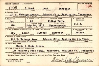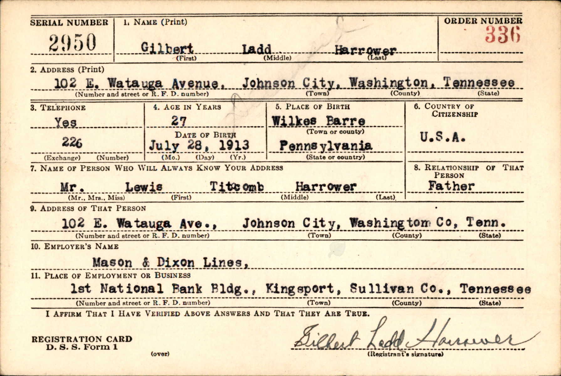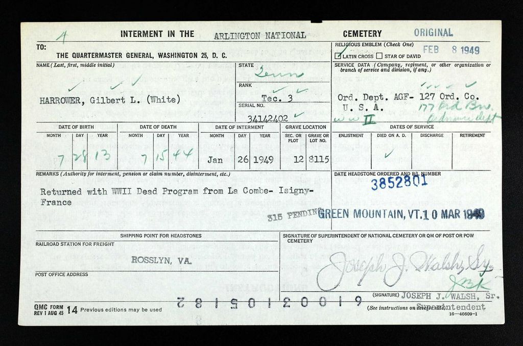 Gilbert Ladd Harrower was born on 28 July 1913 at Wilkes Barre, Luzerne, Pennsylvania, the son of Lewis Titcomb Harrower and Margaret Ayars. He resided at Johnson City, Washington County, Tennesse in 1940 and enlisted on 28 June 1941 at Fort Oglethorpe, Georgia. He was killed in action in France on 15 July 1944 and was returned from La Cambe-Isigny in France. He is buried at Arlington National Cemetery in Virginia, 12, 8115.
