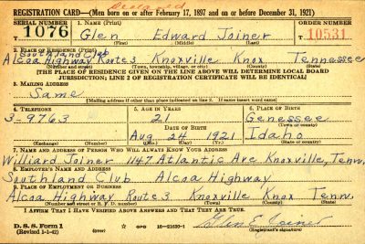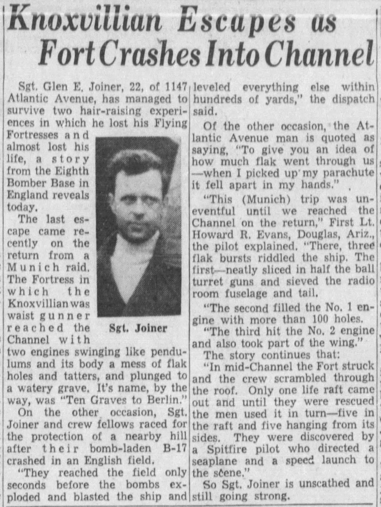 Sgt. Glen E. Joiner, 22, of 1147 Atlantic Avenue, has managed to survive two hair-raising experiences in which he lost his FLying Fortresses and almost lost his life, a story from the Eight Bomber Base in England reveals today. The last escape came recently on the return from a Munich raid. The Fortress in which the Knoxvillian was waist gunner reached the Channel with two engines swinging like pendulums and its body a mess of flak holes and tatters, and plunged to a watery grave. It’s name, by the way, was “Ten Graves to Berlin.” On the other occasion, Sgt. Joiner and crew fellows raced for the protection of a nearby hill after their bomb-laden B-17 crashed in an English field. “They reached the field only seconds before the bobs exploded and blasted the ship and leveled everything else within hundreds of yards,” the dispatch said. Of the other occasion, the Atlantic Avenue man is quoted as saying, “To give you an idea of how much flak went through us – when I picked up my parachuste it fell apart in my hands.”