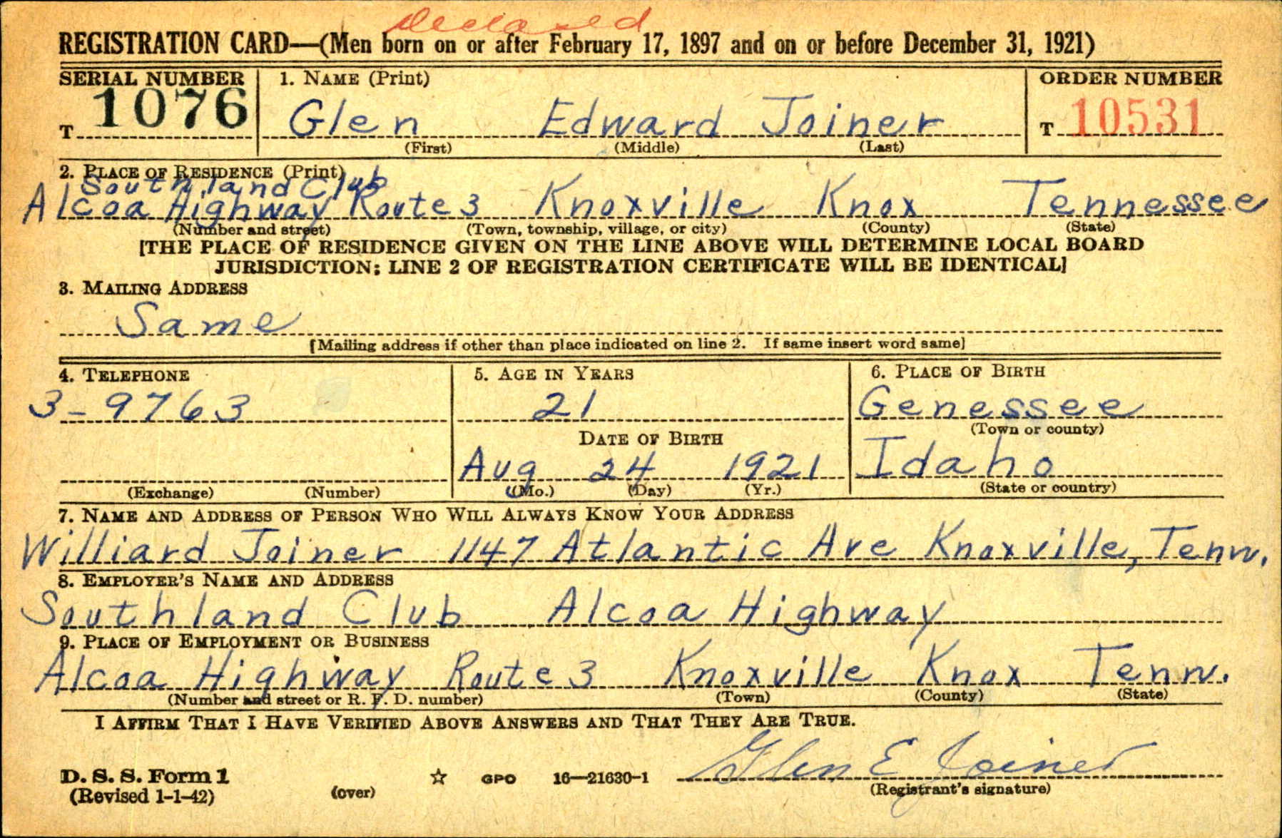 Glen Edward Joiner was born in Genessee, Idaho, thee son of John Richard Joiner and Dora Padgett. His father died in 1921 after which his mother remarried with Charles Swaggerty. He had four brothers, Estel Clarence Joinere, Alvin Richard Joiner, Sherman Joiner and Willard Sherman Joiner and a sister, Margaret Louise Joiner. Also a step-sister, Helen I. Swaggerty and a half-brother Edward Swaggerty. His brother, Sgt. William S. Joiner was awarded the Bronze Star in Germany. Glen enlisted in the Air Corps on August 21, 1942, in Camp Forrest, TN. He was promoted to Sergeant at Fort Myers in Florida in April, 1943.