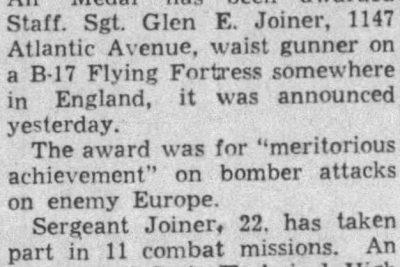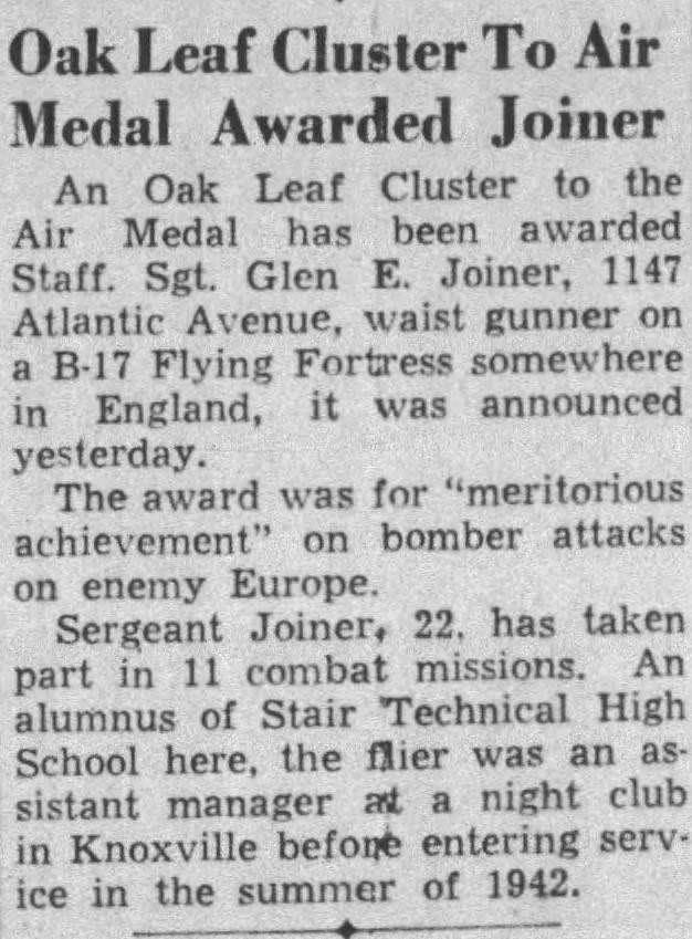 An Oak Leaf Cluster to the Air Medal has been awarded Staff Sgt. Glen E. Joiner, 1147 Atlantic Avenue, waist gunner on a B-17 Flying Fortress somewhere in England, it was announced yesterday. The award was for “meritorious achievement”on bomber attacks on enemy Europe. Sergeant Joiner, 22, has taken part in 11 combat missions. An alumnus of Stair Technical High School here, the flier was an assistant manager at a night club in Knoxville before entering service in the summer of 1942.