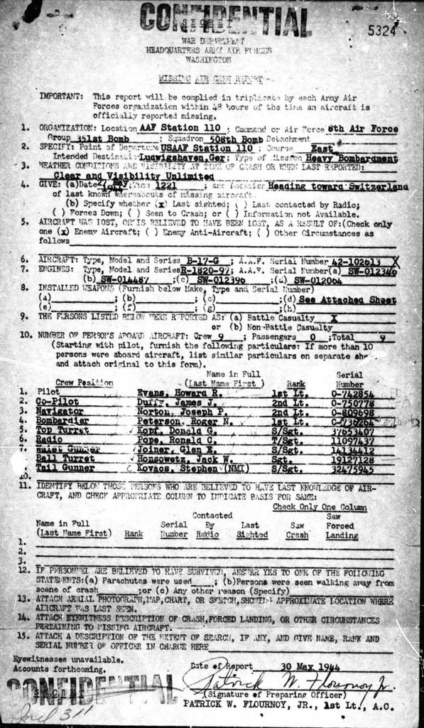 I was flying as pilot of aircraft #42-97202 which was in No. 3 position of the Lead Element of the High Squadron on a mission to Ludwigshaven, Germany on May 27, 1944. I first saw Lt Howard R. Evans apparently after he had been attacked by enemy fighters because the propeller of his no. 3 engine was feathered. I noticed a white vapor coming from his gas tanks and presumed that they had been hit in this attack in addition to the no. 3 engine. Then I saw him attacked by enemy fighters and a black vapor appeared which indicated an oil leak. After this attack he pulled out of formation and headed toward Switzerland under control. The Alps were plainly visible from where we were. I saw no parachutes nor did I hear anything from Lt Evans on VHF.