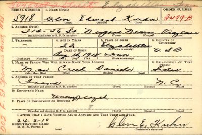 Glen Edward Kuhn was initially buried at Blosville Cemetery at Carentan, France and reburied at Normandy American Cemetery, Colleville-sur-Mer, France, D, 15, 27
