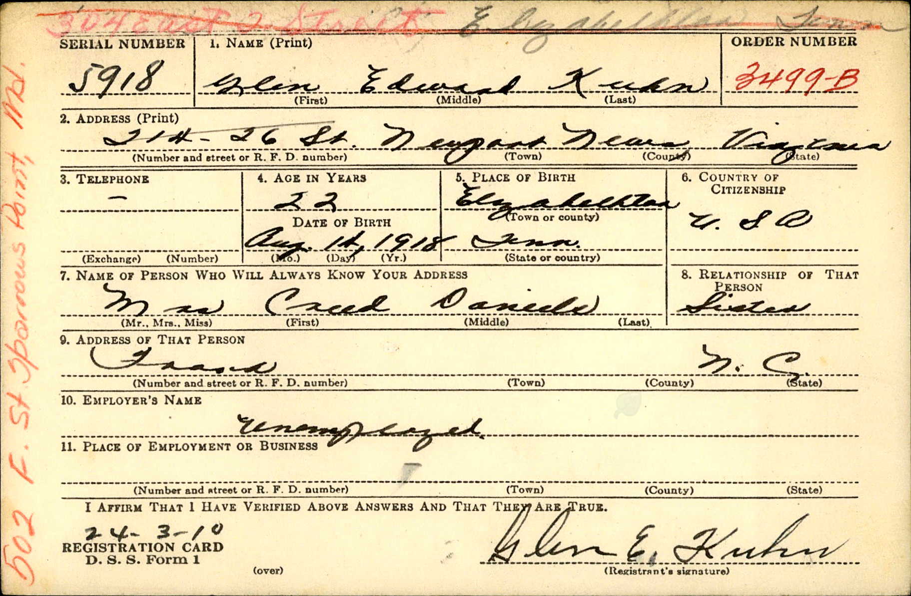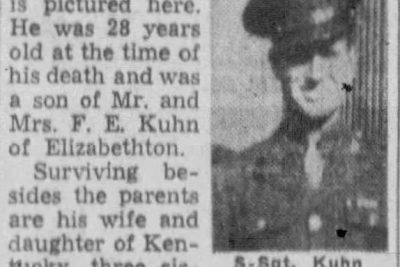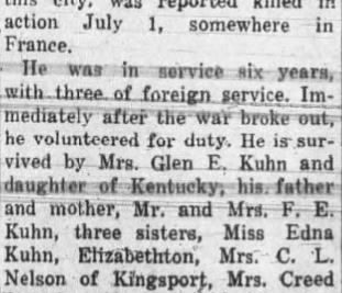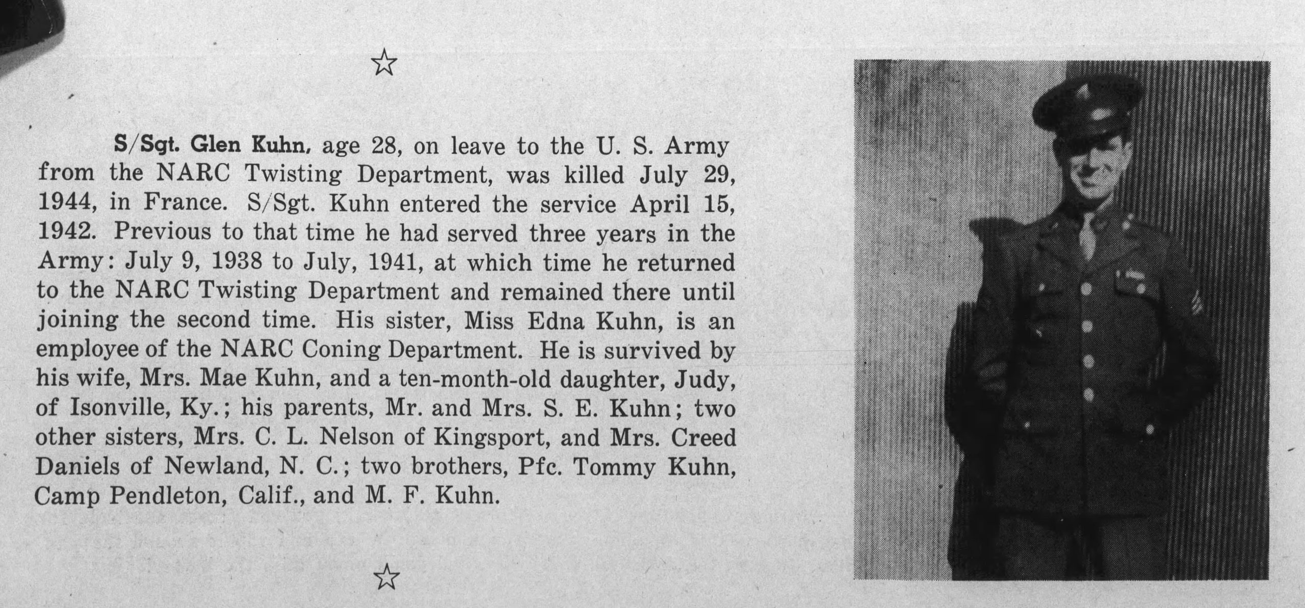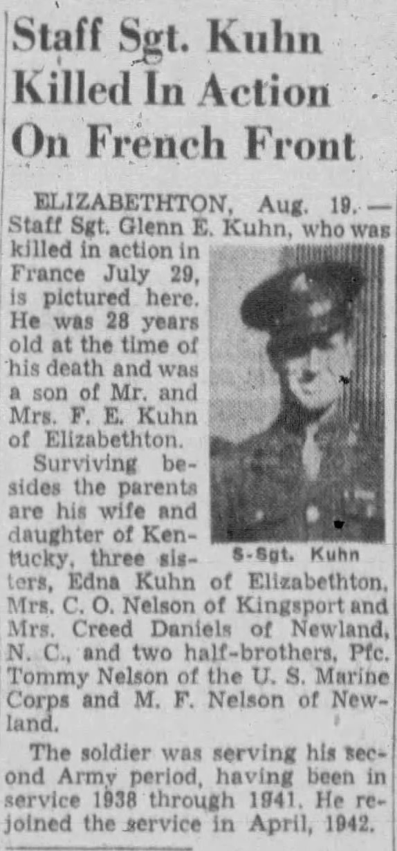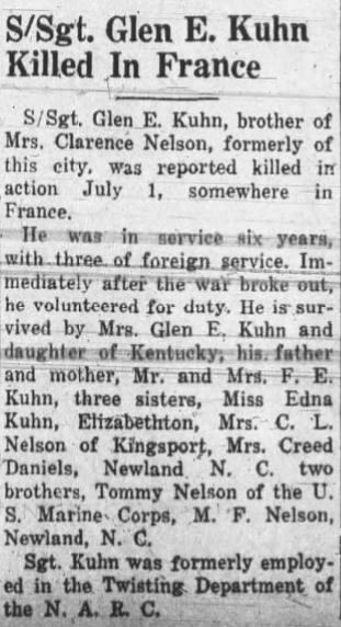 S/Sgt Glen E. Kuhn, brother of Mrs. Clarence Nelson, formerly of this city, was reported killed in action July 1, somewhere in France. He was in service six years, with three of foreign service. Immediately after the war broke out, he volunteered for duty. He is survived by Mrs. Glen E. Kuhn and daughter of Kentucky, his father and mother, Mr. and Mrs. F.E. Kuhn, three sisters, Miss Edna Kuhn, Elizabethton, Mrs. C.L. Nelson of Kingsport, Mrs. Creed Daniels, Newland N.C., two brothers, Tommy nelson of the U.S. Marine Corps, M.F. Nelson, Newland, N.C. Sgt. Kuhn was formerly employed in the Twisting Department of the N.A.R.C.
