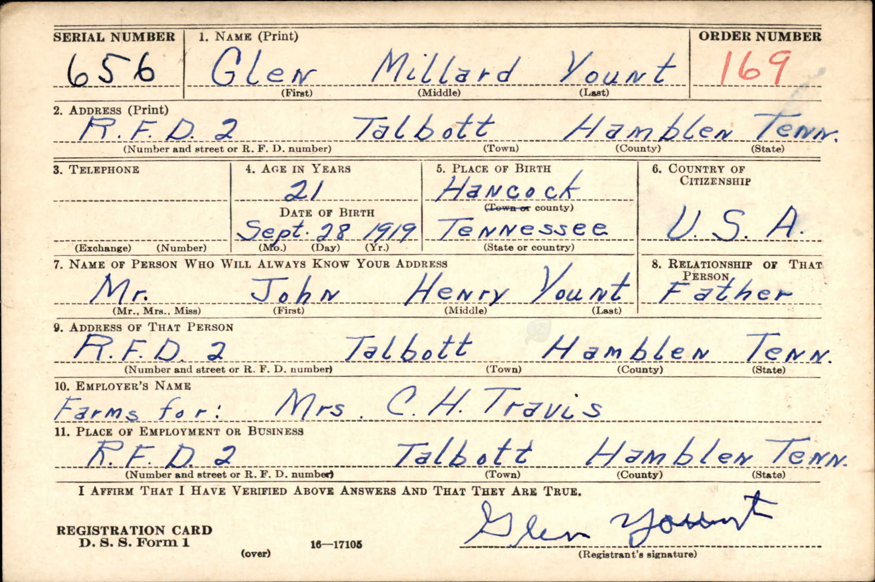 Glen Millard Yount was born on 28 September 1919, the son of John Henry Yount and Ella Mae Blankenship.