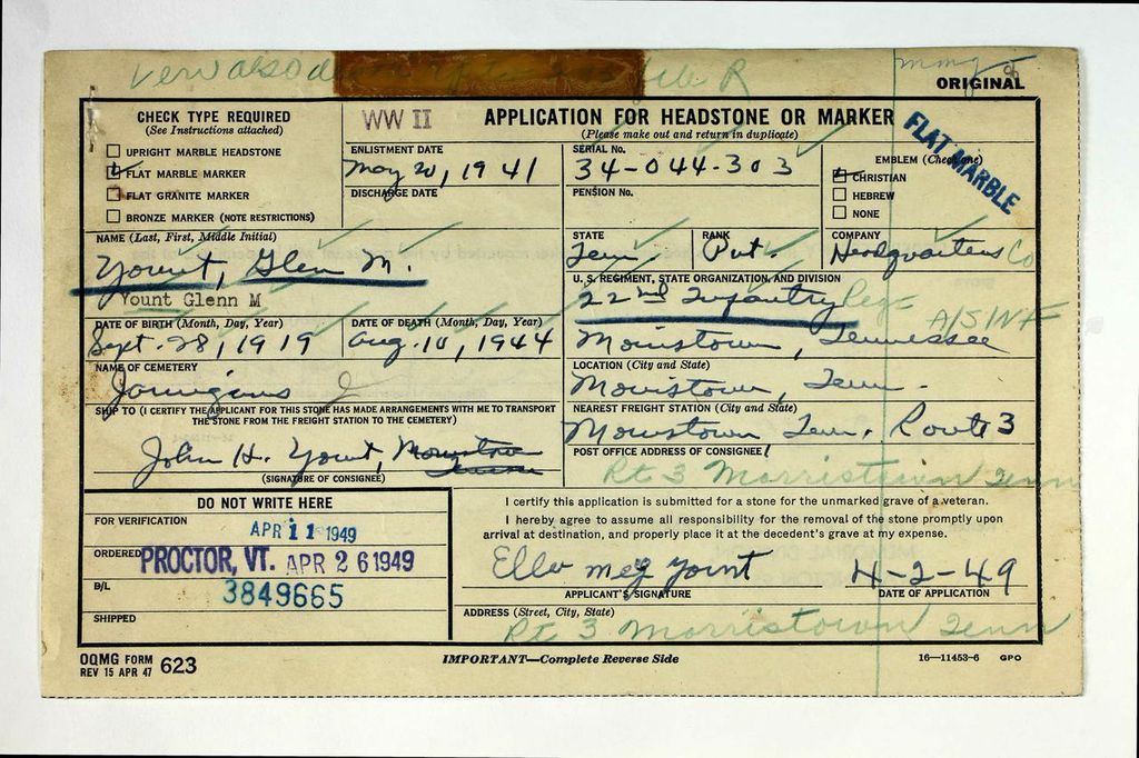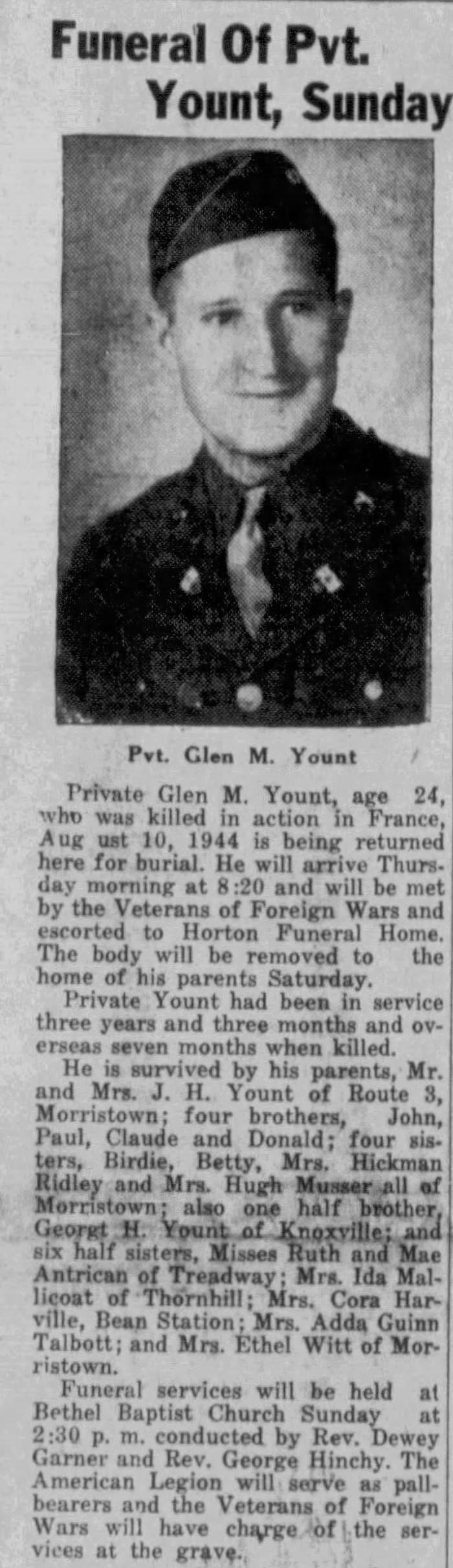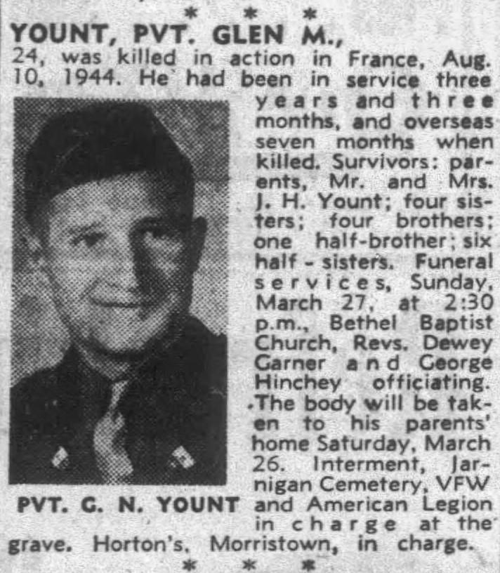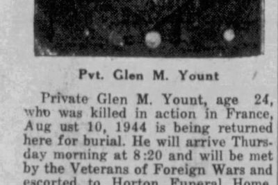 Pvt. Glen M. Yount, 24, was killed in action in France, Aug. 10, 1944. He had been in service three years and three months when killed. Survivors: parents, Mr. and Mrs. J.H. Yount; four sisters; four brothers; six half-sisters.