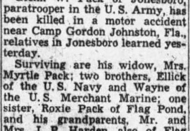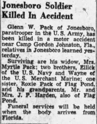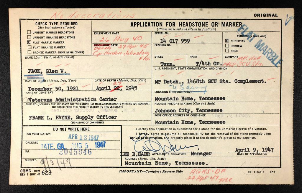 Glen Wood Pack was born on 30 December 1921 in North Carolina, the son of Martin Van Buren Pack and Austria Hardin. Glen was living in Flag Pond, Unicoi County, Tennessee with his family when he enlisted in the United States Army on 26 August 1940 at Fort McPherson, Atlanta, Georgia. He was assigned service number 14017959 to the Military Police Detachment, 1468th Station Complement Unit (SCU), Camp Gordon Johnston, Carrabelle, Florida when he died non battle on 22 April 1945.