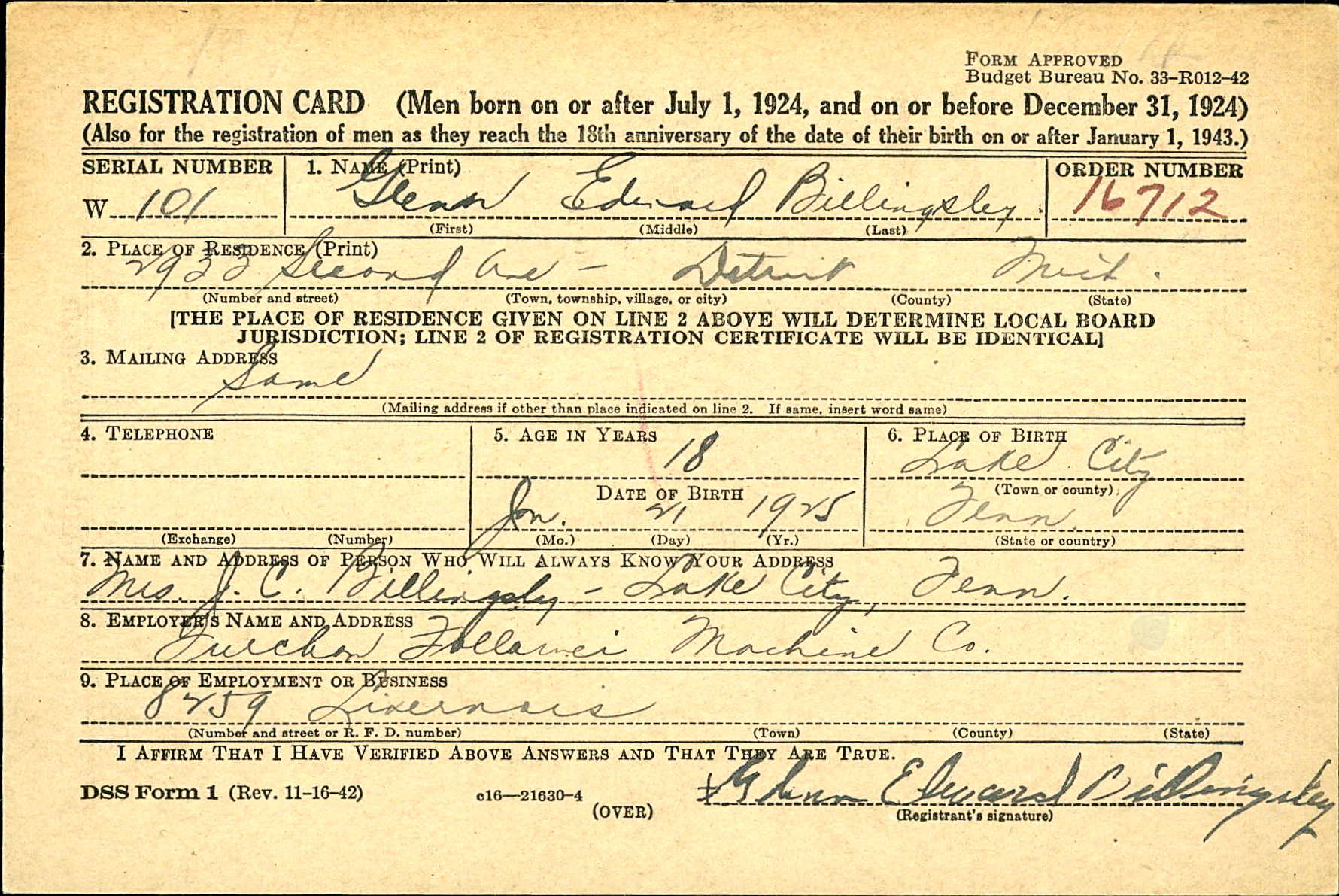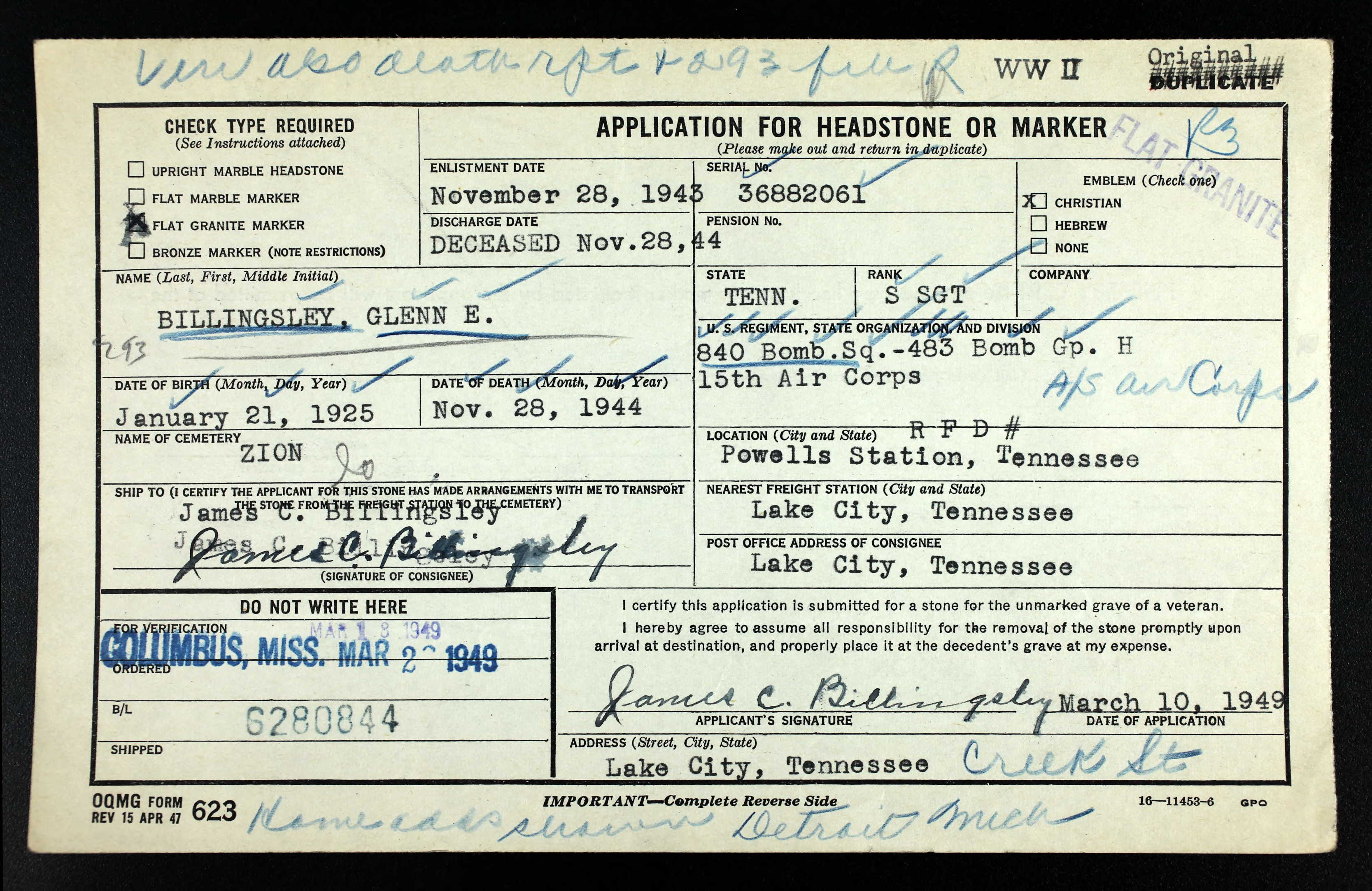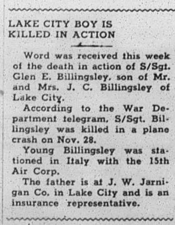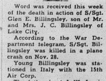 Word has received this week of the death in action of S/Sgt. Glen E. Billingsley, son of Mr. and Mrs. J.C. Billingsley of Lake City. According to the War Department telegram, S/Sgt Billingsley was killed in a plane crash on Nov. 28. Young Billingsley was stationed in Italy with the 15th Air Corp. The father is at J.W. Jarnigan Co. In Lake City and is an Insurance representative.