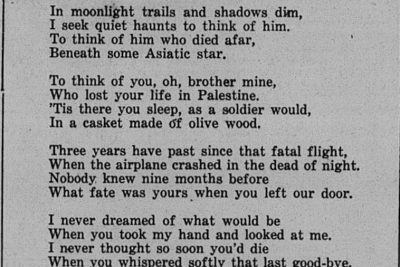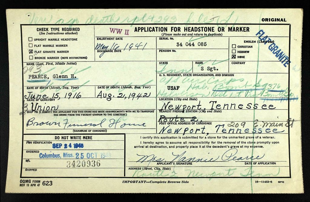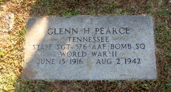 Sergeant Pearce was killed in action in Word War II on Aug. 2, 1942. He was twenty-six years old at the time of his death. He entered service May 16, 1941 and was a member of the Halpro Crew (A/C 41-11601, Nickname Hellzapoppin). In the latter part of May 1942, this crew left West Palm Beach, Florida en route to North Africa. The crew was stationed in Egypt but due to a minor airplane wreck, Glenn was separated from his regular plane crew. He was left in Egypt to repair the plane while the others went on a bombing mission. They were interred in Turkey. Thereafter he served as a substitute. During the early morning hours of Aug. 2, 1942, when returning from a successful bombing mission to Romania, Glenn was killed instantly near the base with eighteen other crew members in a serious airplane crash. He was flight engineer at the time of his death. He was buried at Telaviv in Palestine and later moved to Algeria, according to official reports.