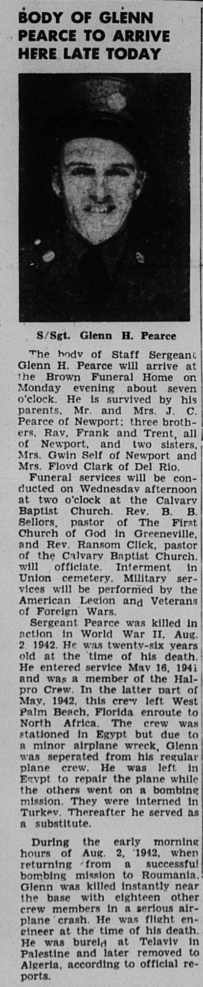 The body of Staff Sergeant Glenn H. Pearce will arrive at the Brown Funeral Home on Monday evening about seven o’clock. He is survived by his parents, Mr. and Mrs. J.C. Pearce of Newport; three brothers, Ray, Frank and Trent, all of Newport and two sisters, Mrs. Gwin Self of Newport and Mrs. Floyd Clark of Del Rio.