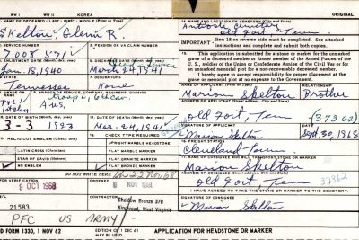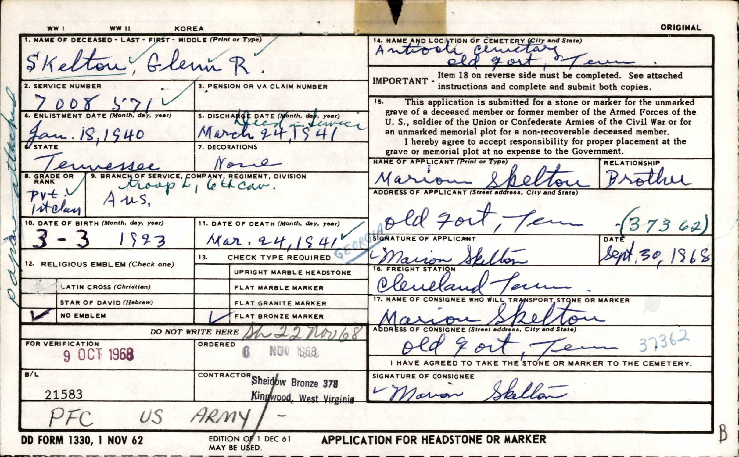 Glenn Skelton lived at Ninth, Catoosa County, Georgia in 1940 and he was stationed at Fort Oglethorpe, Georgia. He died at Catoosa County, Georgia and is buried at Antioch Church of Christ Cemetery, Oldfort, Polk County, Tennessee.