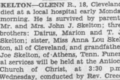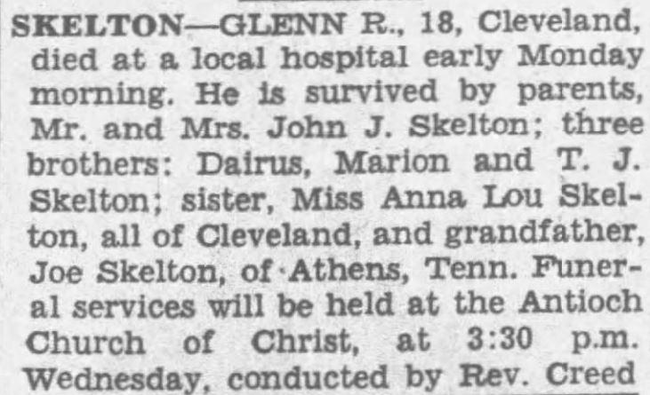 Glenn R. Skelton, 18, Cleveland, died at a local hospital early Monday morning. He is survived by parents, Mr. and Mrs. John J. Skelton; three brothers, Dairus, Marion and T.J. Skelton; sister, Miss Anna Lou Skelton, all of Cleveland, and grandfather, Joe Skelton of Athens, Tenn.