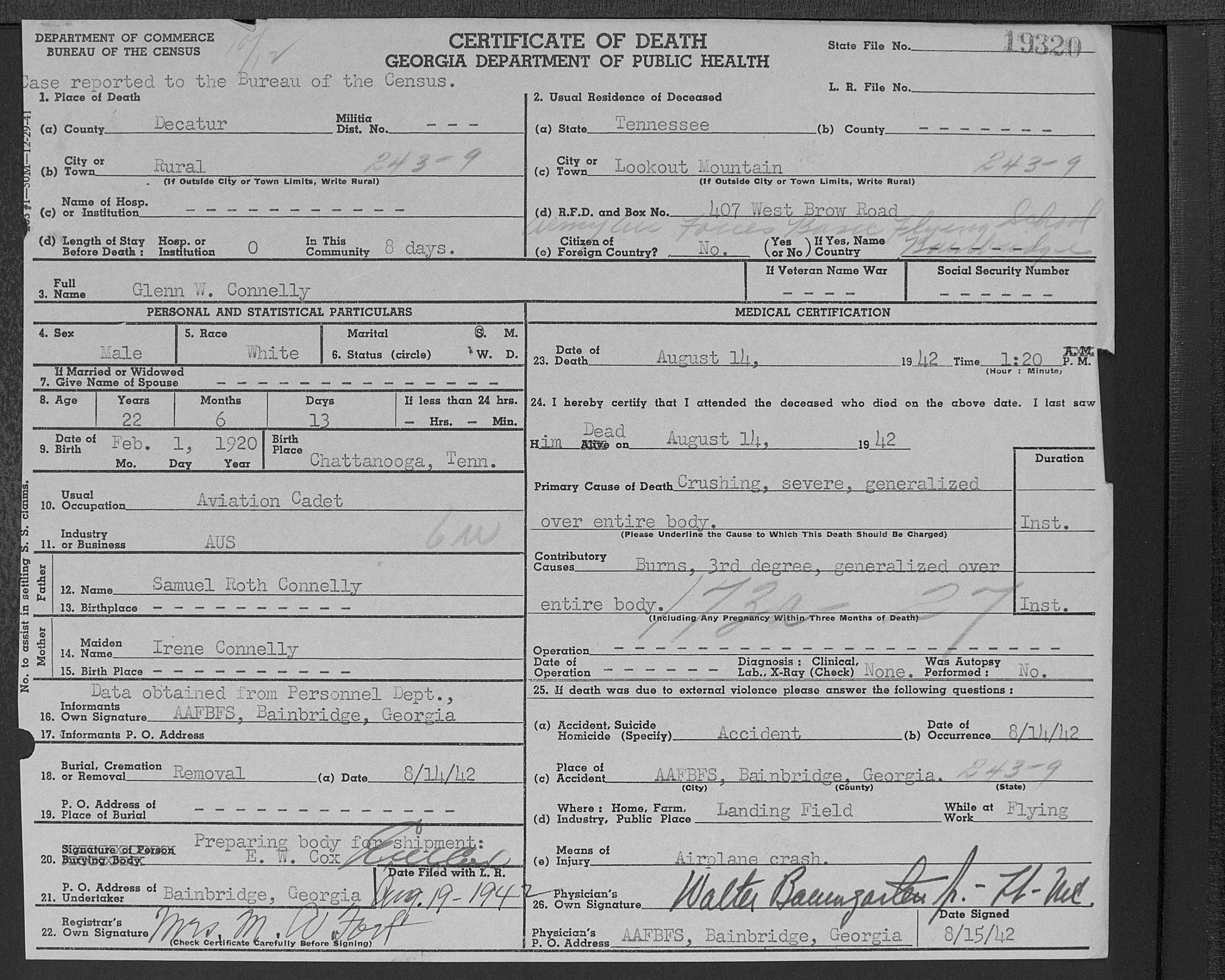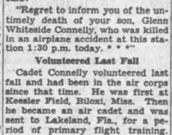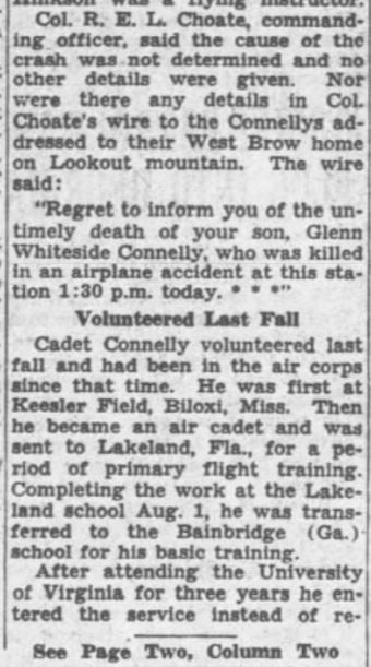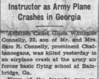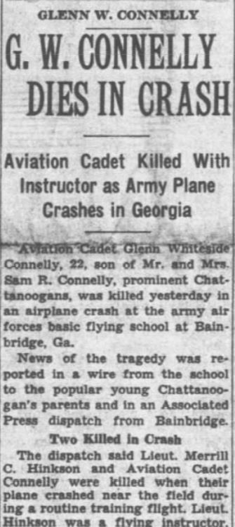 Aviation Cadet Glenn Whiteside Connelly, 22, son of Mr. and Mrs. Sam R. Connelly, prominent Chattanoogans, was killed yesterday in an airplane crash at the army air forces basic flying school at Bainbridge, Ga. News of the tragedy was reported in a wire from the school to the popular young Chattanoogan’s parents and in an Associated Press dispatch from Bainbridge. The dispatch said Lieut. Merrill C. Hinkson and Aviation Cadet Connelly were killed when their plane crashed near the field during a routine training flight. Lieut. Hinkson was a flying instructor. Col. R.E.L. Choate, Commanding officer, said the cause of the crash was not determined and no other details were given. Nor were there any details in Co. Choate’s wire to the Connelly’s addressed to their West Brow home on Lookout mountain. The wire said: “Regret to inform you of the untimely death of your son, Glenn Whiteside Connelly, who was killed in an airplane accident at this station 1:30 p.m. today.***”