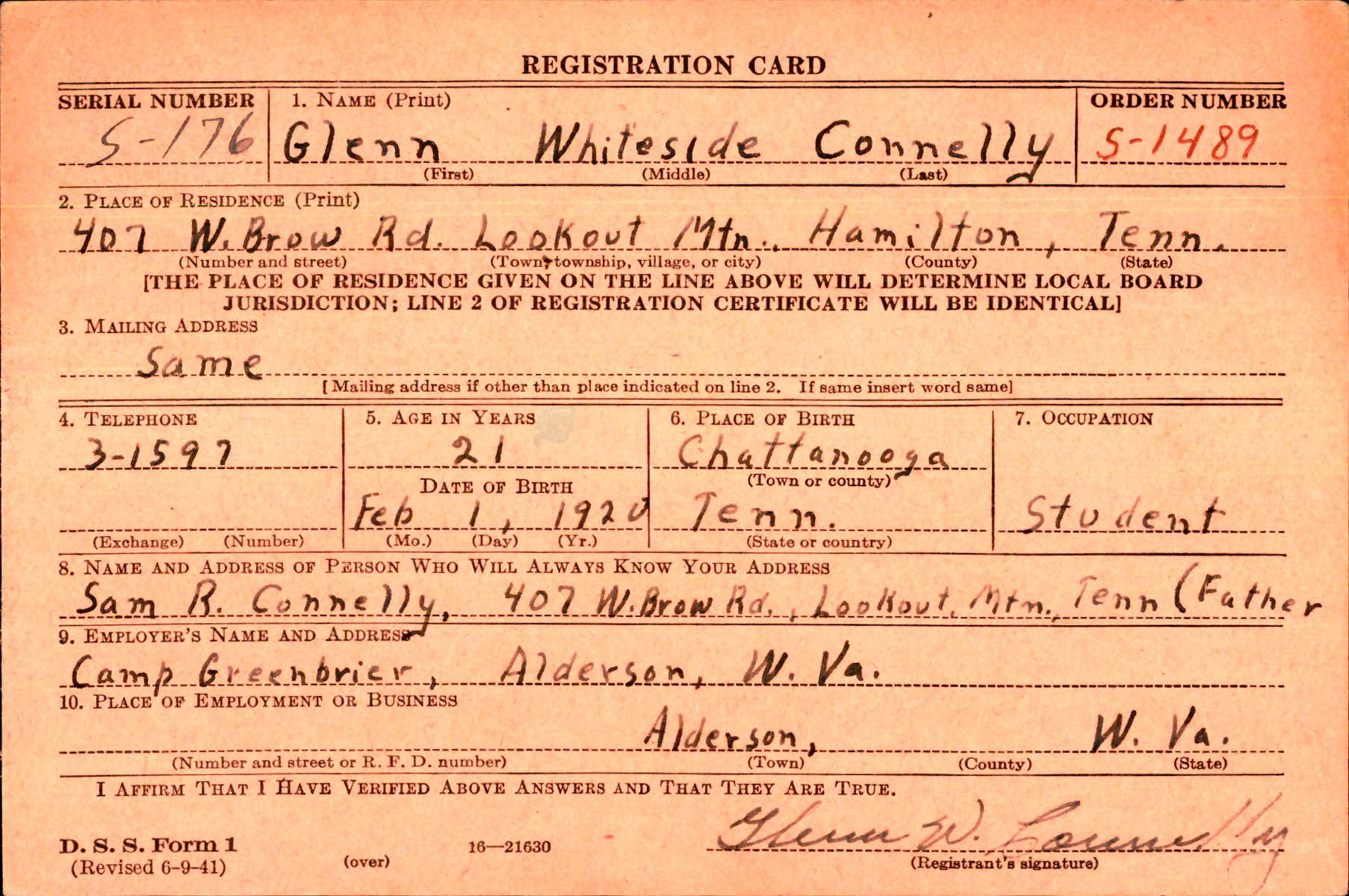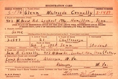 Glenn Whiteside Connelly was born in Chattanooga to Samuel Roth Connelly and Irene Louise Whiteside. His brother, Samuel Roth Connelly Jr. was killed in action in Germany in 1943.