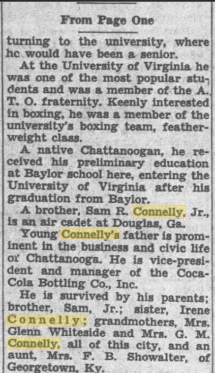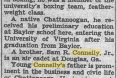 Cadet Connelly volunteered last fall and had been in the air corps since that time. He was first at Keesler Field, Biloxi, Miss. Then he became an air cadet and was sent to Lakeland, Fla., for a period of primary flight training. Completing the work at the Lakeland school Aug. 1, he was transferred to the Bainbridge (Ga.) school for his basic training. After attending the University of Virginia for three years he entered the service instead of returning to the university, where he would have been a senior. At the University of Virginia, he was one of the most popular students and was a member of the A.T.O. fraternity. Keenly interested in boxing, he was a member of the university’s boxing team, featherweight class. A native of Chattanooga, he received his preliminary education at Baylor school here, entering the university of Virginia after his graduation from Baylor. A brother, Sam R. Connelly Jr., is an air cadet at Douglas, Ga. Young Connelly’s father is prominent in the business and civic life of Chattanooga. He is vice-president and manager of the Coca-Cola Bottling Co., Inc.