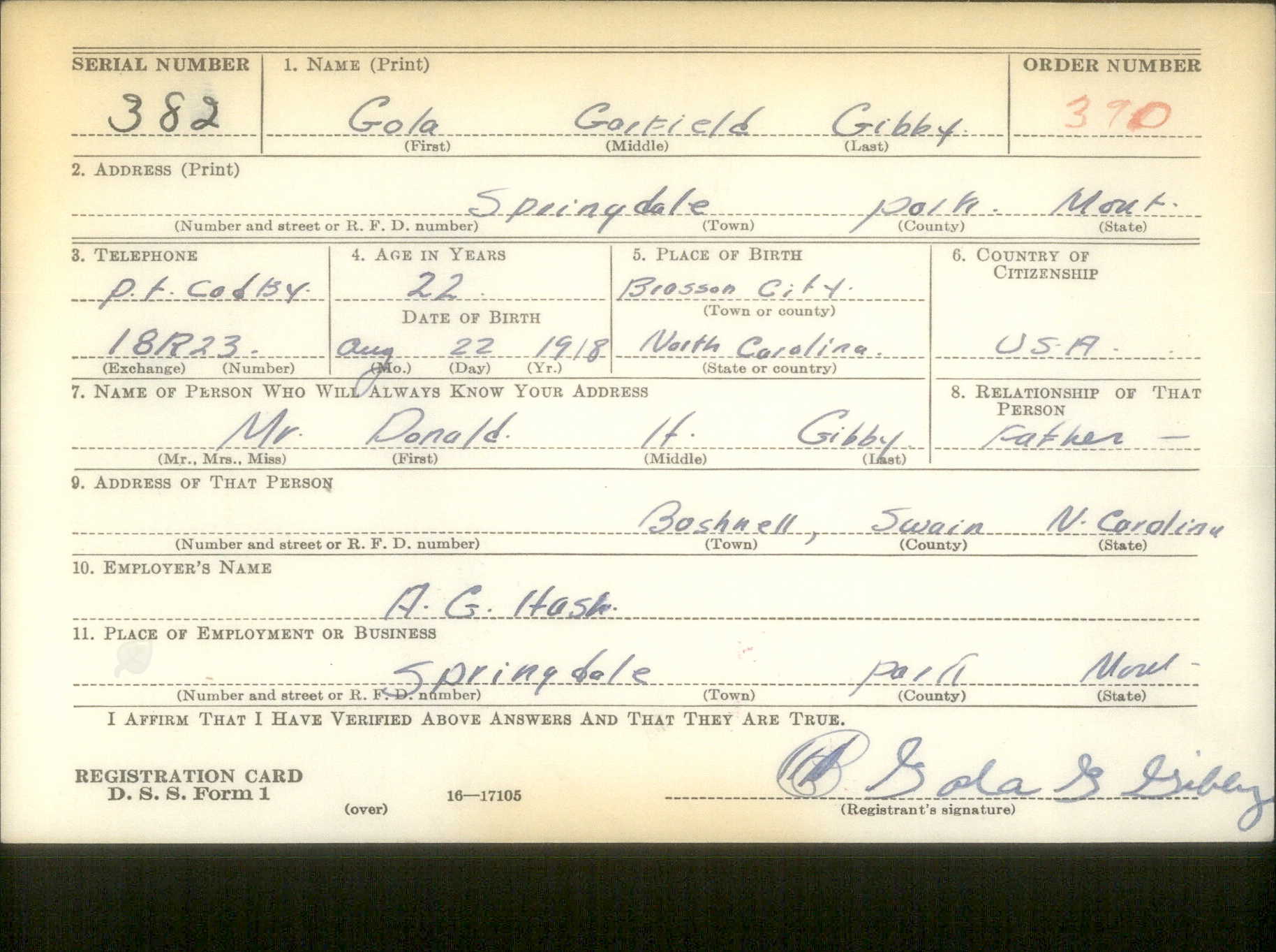 Gola G. Gibby was the son of Dock Haylman and Esther Gibby of Nantahala, Swain County, North Carolina. His mother died before his third birthday and he lived with his father and grandparents in Nantahala, North Carolina. Gola attended grammar school and worked on the farm raising livestock. He joined the US Army Air Corps on November 21, 1941 in Missoula, Montana and listed his hometown as Madisonville, Tennessee.