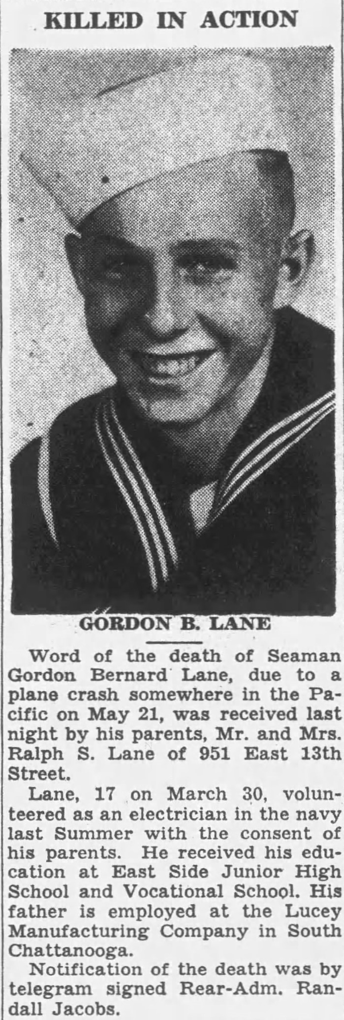 Lane, 17 on March 30, volunteered as an electrician in the navy last Summer with the consent of his parents. He received his education at East Side Junior High School and Vocational School. His father is employed at the Lucey Manufacturing Company in South Chattanooga. Notification of the death was by telegram signed Rear-Adm. Randall Jacobs.