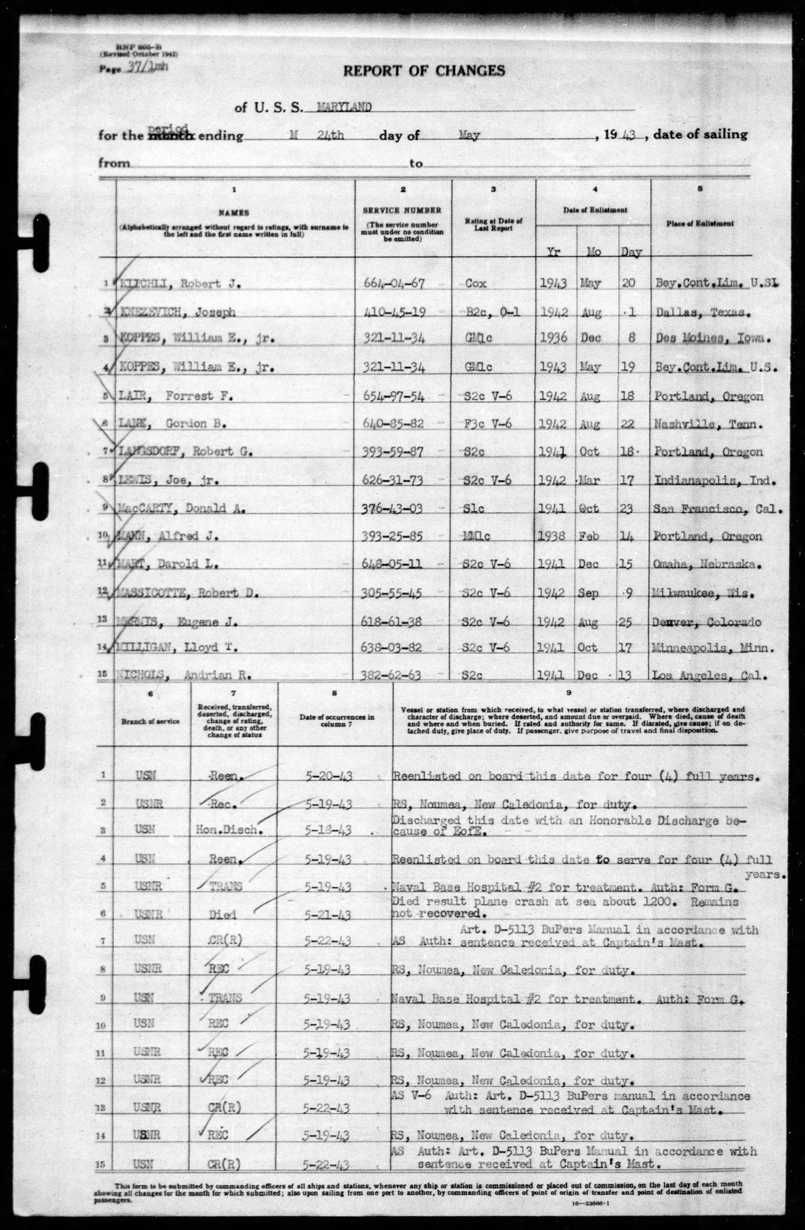 Gordon Lane served on the U.S.S. Maryland. He died as a result of a plane crash at sea about 1200. His remains were not recovered. Memorialized at the Honolulu Memorial, HI