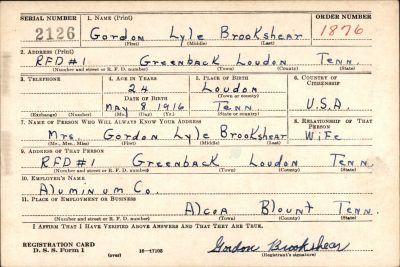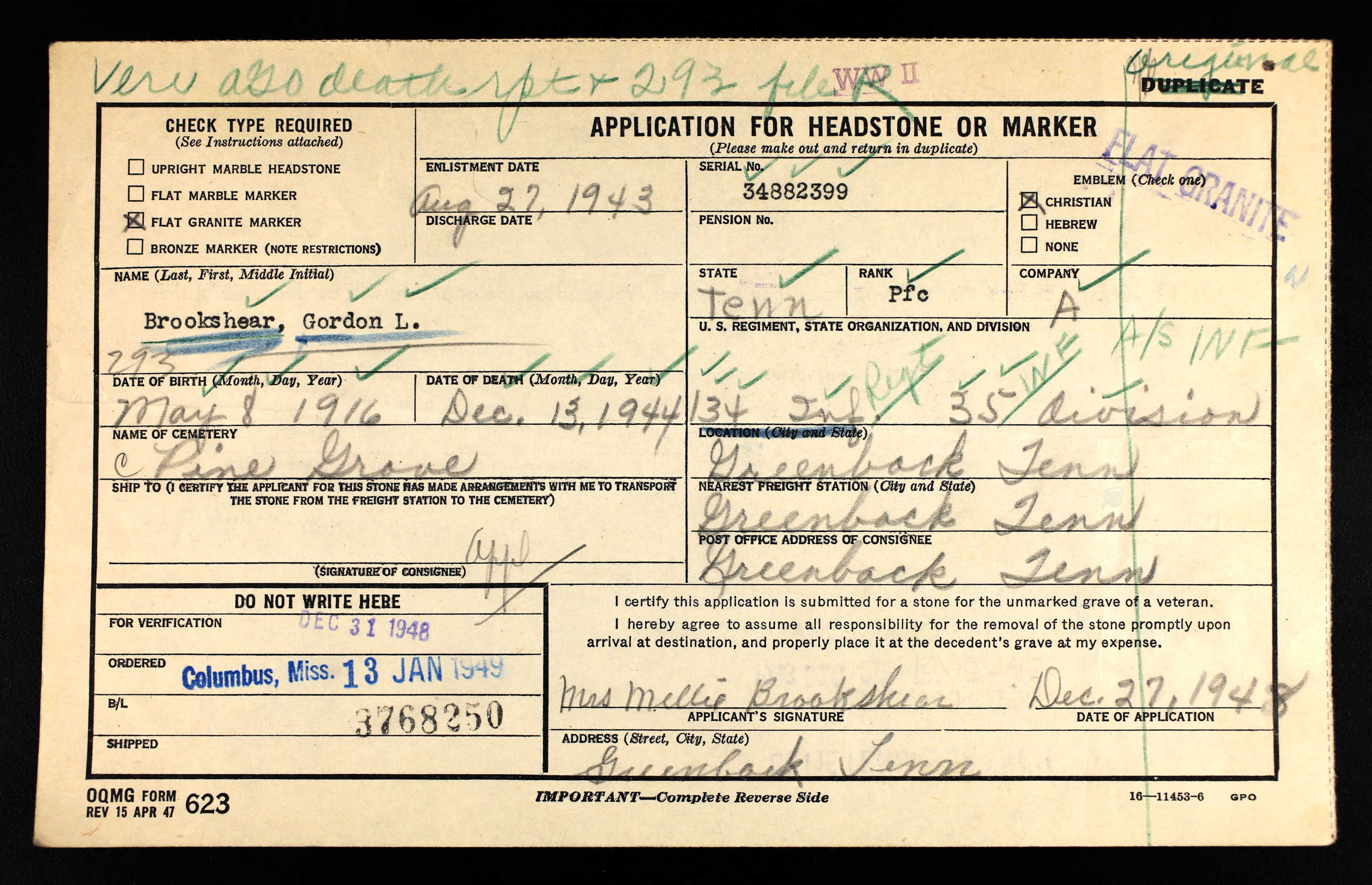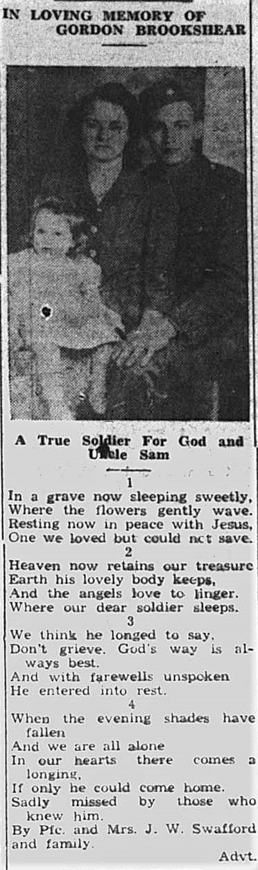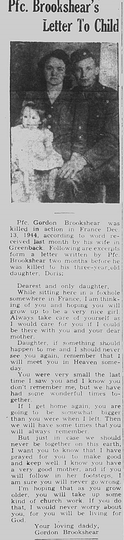 Pfc. Gordon Brookshear was killed in action in France, Dec. 13, 1944, according to word received last month by his wife in Greenback. Following excerpts from a letter written by Pfc. Brookshear two months before he was killed to his three-year-old daughter, Doris: