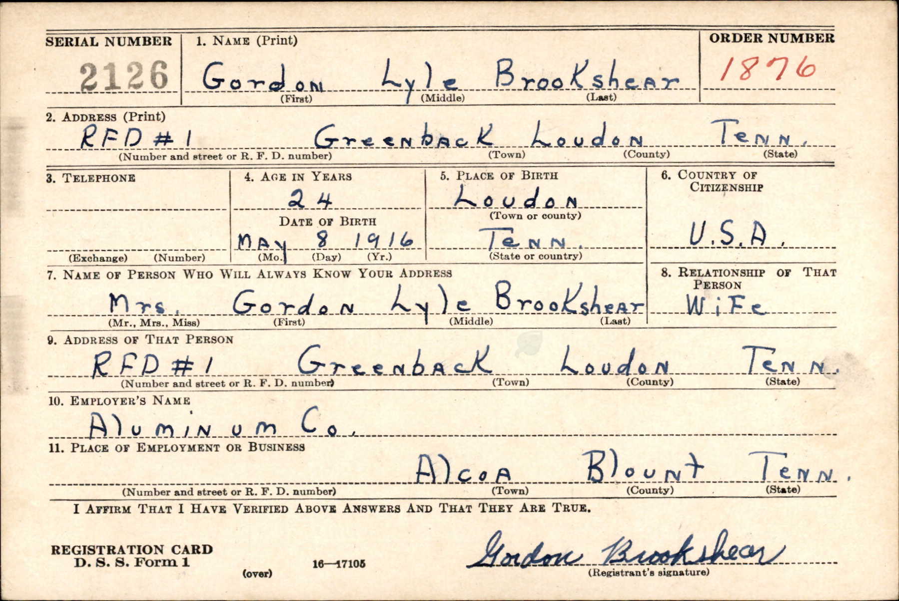 Gordon Lyle Brookshear was born 8 May 1916 to Walter J. Brookshear and Marinda Melvina Ramsey. He was married to Eula Bea Lindsay and father of Doris Brookshear Trotter.