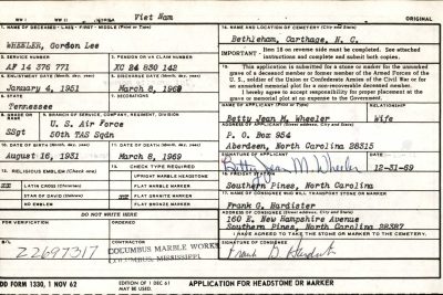 SSGT Gordon Lee Wheeler, Korean War Veteran Vietnam War Veteran, Born in Maryville, Tennessee, he became a resident of Moore County, NC. SSGT Gordon Lee Wheeler was a casualty of the Vietnam War. As a member of the Air Force, SSGT Wheeler served our country until March 8th, 1969 in Quand Tri, South Vietnam. He was 37 years old and was married. It was reported that He was killed when his plane crashed. He was born in Maryville, Tennessee, on August 16th, 1931. His body was recovered. SSGT Wheeler is on panel 30W, line 082 of the Vietnam Memorial Wall in Washington D.C. He served our country for 18 years.We miss you, Dad! Wow, it seems like a lifetime since I heard of your death. I still remember seeing the military car driving up to the house, and I remember asking Mom what were they doing I remember it as if it happened yesterday. All of your children are now grown, and most of us have our own children and grandchildren. Mom passed away in June of 2001, and I miss her too! I think of you often and think that the younger children would have benefited so much if they could have known you . . they only have memories from a made-up father. I have tried to tell them over the years that we had some good times together as a family and that you were a great father at those times. Your mother and father have passed away, as well as many of your siblings and their spouses. Several of us older children visited Tennessee a couple of years ago and were able to visit your sister, Margie. She has since passed away. I was very surprised this year when I received a package in the mail and Sissy, Margie’s daughter, had mailed me pictures of you as a young boy. I truly enjoyed seeing you in those happy, carefree times. I’ll always love you, and miss you, Dad. Debra Wheeler Marion, Eldest daughter of six children, Carthage, NC 28327.Well “Wrinkles” it has been 37 years since we were flying those C-130’s around the world, and having a beer once in awhile. I have gone on and gotten old, however, I still remember the good times that we had. You are not forgotten old buddy ~ your Navigator. Robert Nobbs.Gordon loved listening to country music! We had a stereo and he played records of many different country singers and would sing along as the records played. I remember him listening to Porter Wagner, Charlie Pride, and specifically a song called “Kalija,” which was something about a poor old Indian head. He enjoyed hunting rabbits with his brother-in-law, Larry Moore, and father-in-law, Dewey Moore. He liked tinkering with automobiles and he sometimes drove on a dirt track in a demolition derby. Gordon was a good hearted man who never met a stranger, he was usually smiling, and in a