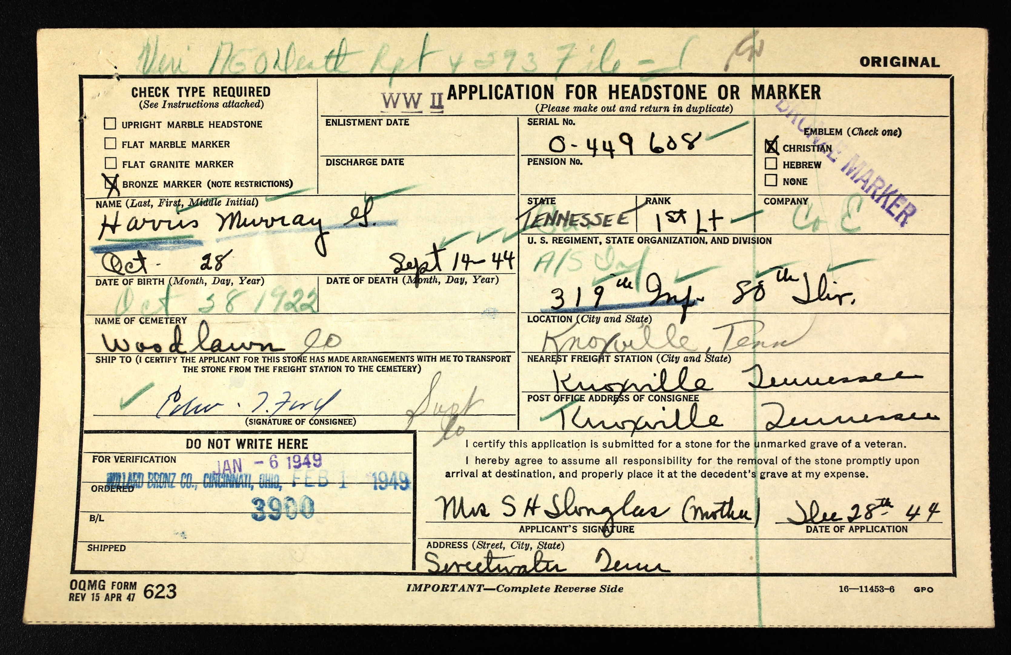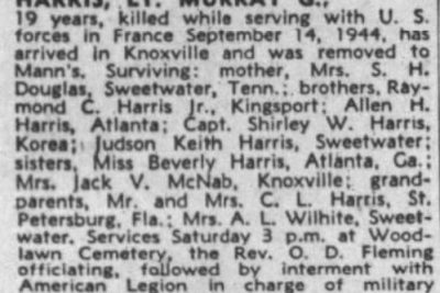 Lt. Murray G. Harris, 19 years, killed while serving with U.S. forces in France September 14, 1944, has arrived in Knoxville and was removed to Mann’s. Surviving: mother, Mrs. S.H. Douglas, Sweetwater, Tenn.; brothers, Raymond C. Harris Jr., Kingsport; Allen H. Harris, Atlanta; Capt. Shirley W. Harris, Korea; Judson Keith Harris, Sweetwater; sisters, Miss Beverly Harris, Atlanta, Ga.; Mrs. Jack V. McNab, Knoxville; grandparents, Mr. and Mrs. C.L. Harris, St. Petersburg, Fla.; Mrs. A.L. Wilhite, Sweetwater.