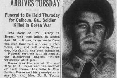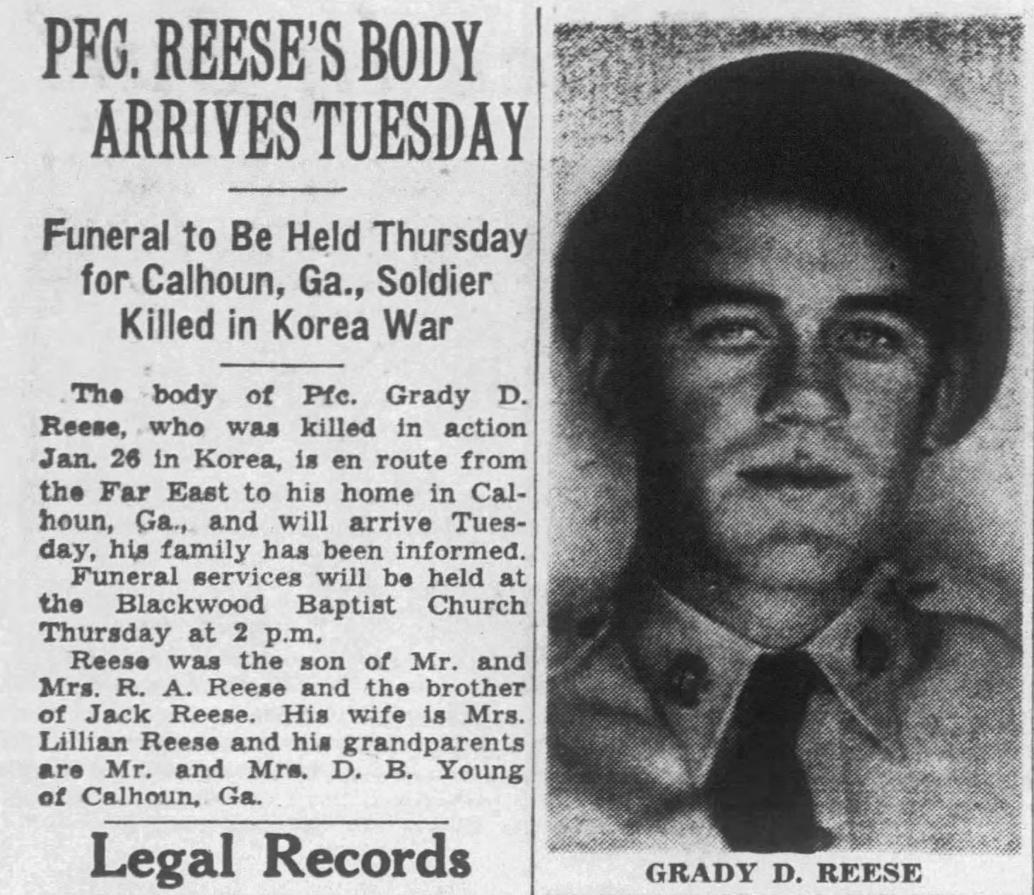 The body of Pfc. Grady D. Reese, who was killed in action Jan. 26 in Korea, is en route from the Far East to his home in Calhoun, Ga., and wil arrived Tuesday, his family has been informed. Funeral services will be held at the Blackwood Baptist Church. Reese was the son of Mr. and Mrs. R.A. Reese and the brother of Jack Reese. His wife is Mrs. Lillian Reese and his grandparents are Mr. and Mrs. D.B. Young of Calhoun, Ga.