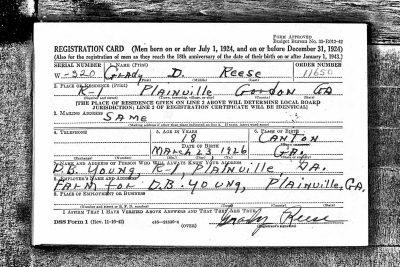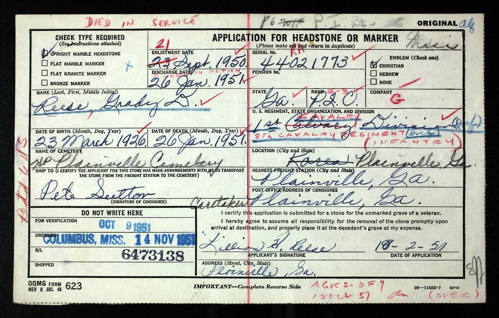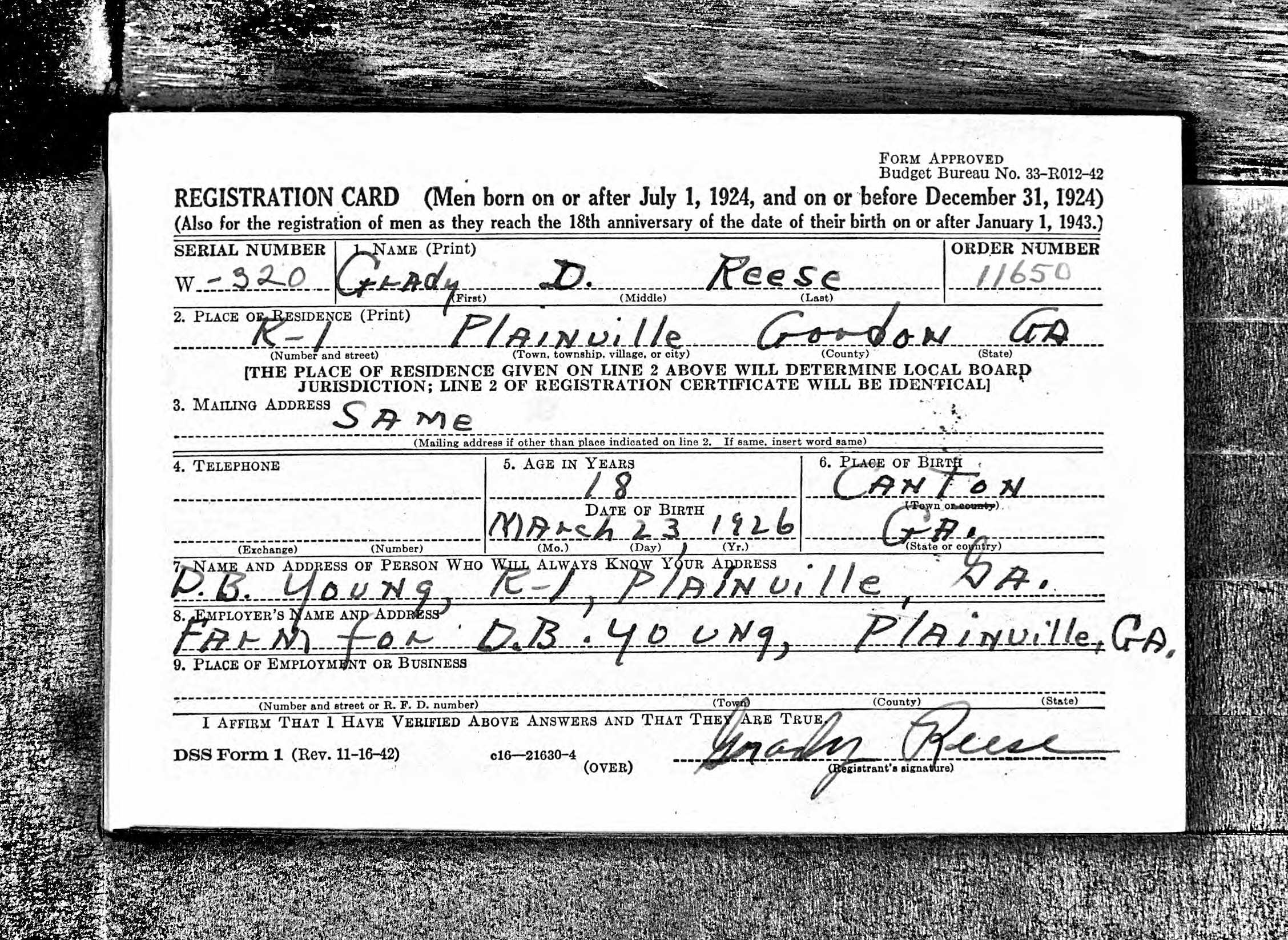 Private First Class Grady D. Reese was born on 23 March 1926 at Canton, Georgia, the son of Ralph Augustus Reese and Ruby Inez Young. Husband of Lillian Harris.