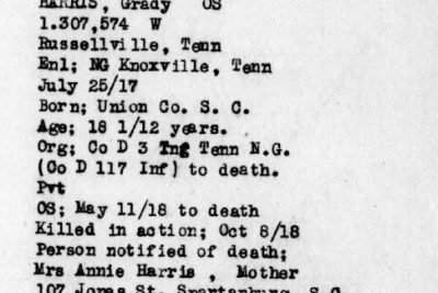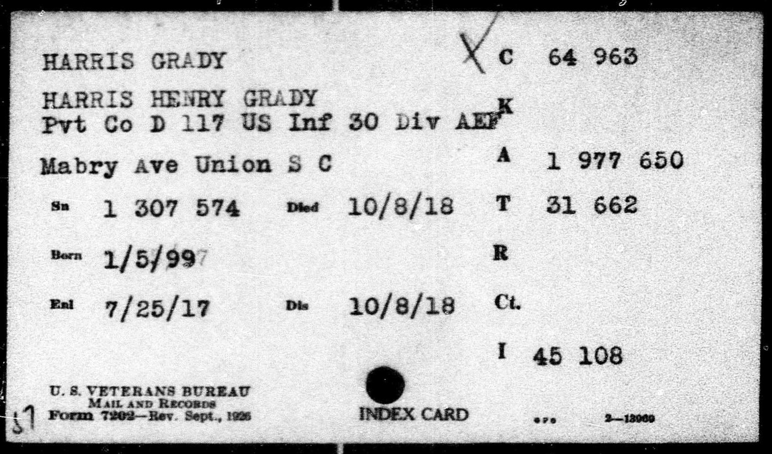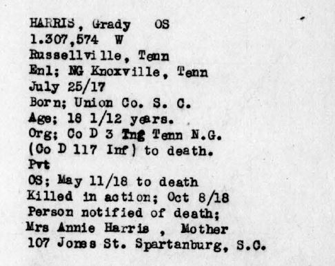 Grady Harris was born in Union County, South Carolina, son of Annie Harris. He enlisted in Knoxville, Tn on July 25, 1917. He was killed in action at the age of 18 near Ester, France while going over the top of a string of German machine gun posts.