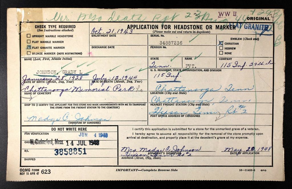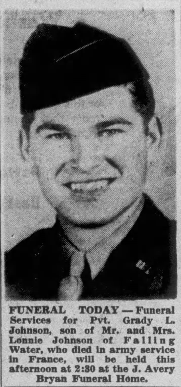 Funeral services for Pvt. Grady L. Johnson, son of Mr. and Mrs. Lonnie Johnson of Falling Water, who died in army service in France, will be held this afternoon at the J. Avery Bryan Funeral Home.