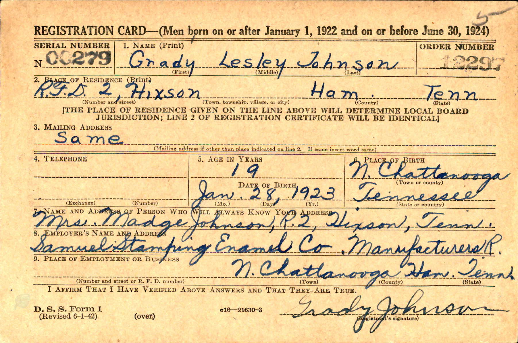 Grady Lesley Johnson was born 28 January 1923 at Chattanooga, Tennessee, the son of Lonnie Varnell Johnson and Susie Douglas.