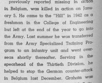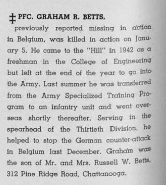 Pfc. Graham R. Betts, was reported killed in action in Belgium. Pfc. Betts, 20, son of Mr. and Mrs. Russell W. Betts, 312 Pine Ridge Road, had been previously listed as missing in action. Pfc. Betts was graduated from Chattanooga High School in 1942. He entered the University of Tennessee School of Engineering at Knoxville, but at the end of one year he entered the army. Last summer he was transferred from a specialized army training program to the infantry and soon after that he went overseas. There, serving with the spearhead of the 30th Division, he helped to stop the German counter-attack in Belgium last December.