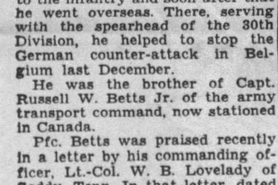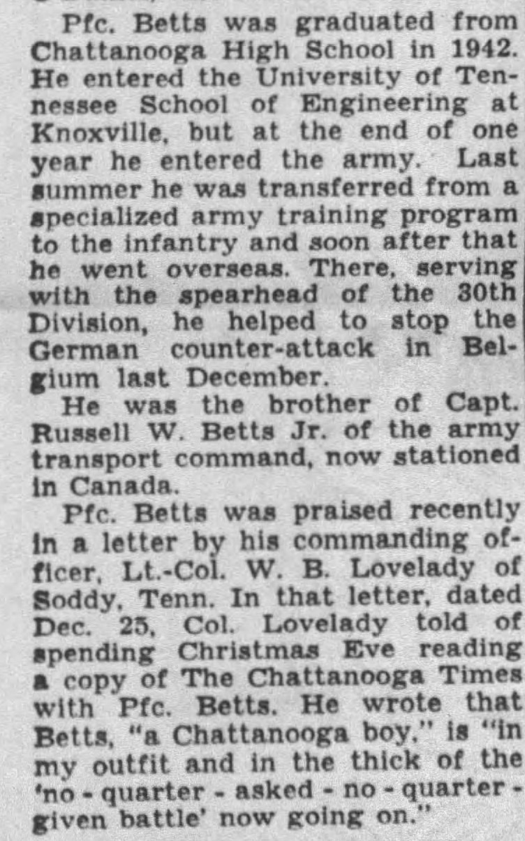 He was the brother of Capt. Russell W. Betts Jr., of the army transport command, now stationed in Canada. Pfc. Betts was praised recently in a letter by his commanding officer, Lt-Col. W.B. Lovelady of Soddy, Tenn. In that letter, dated Dec. 25, Col. Colelady told of spending Christmas Eve reading a copy of The Chattanooga Times with Pfc. Betts. He wrote that Betts, “a Chattanooga boy” is “in my outfit and in the thick of the no-quarter-asked-no-quarter-given bettle now going on.