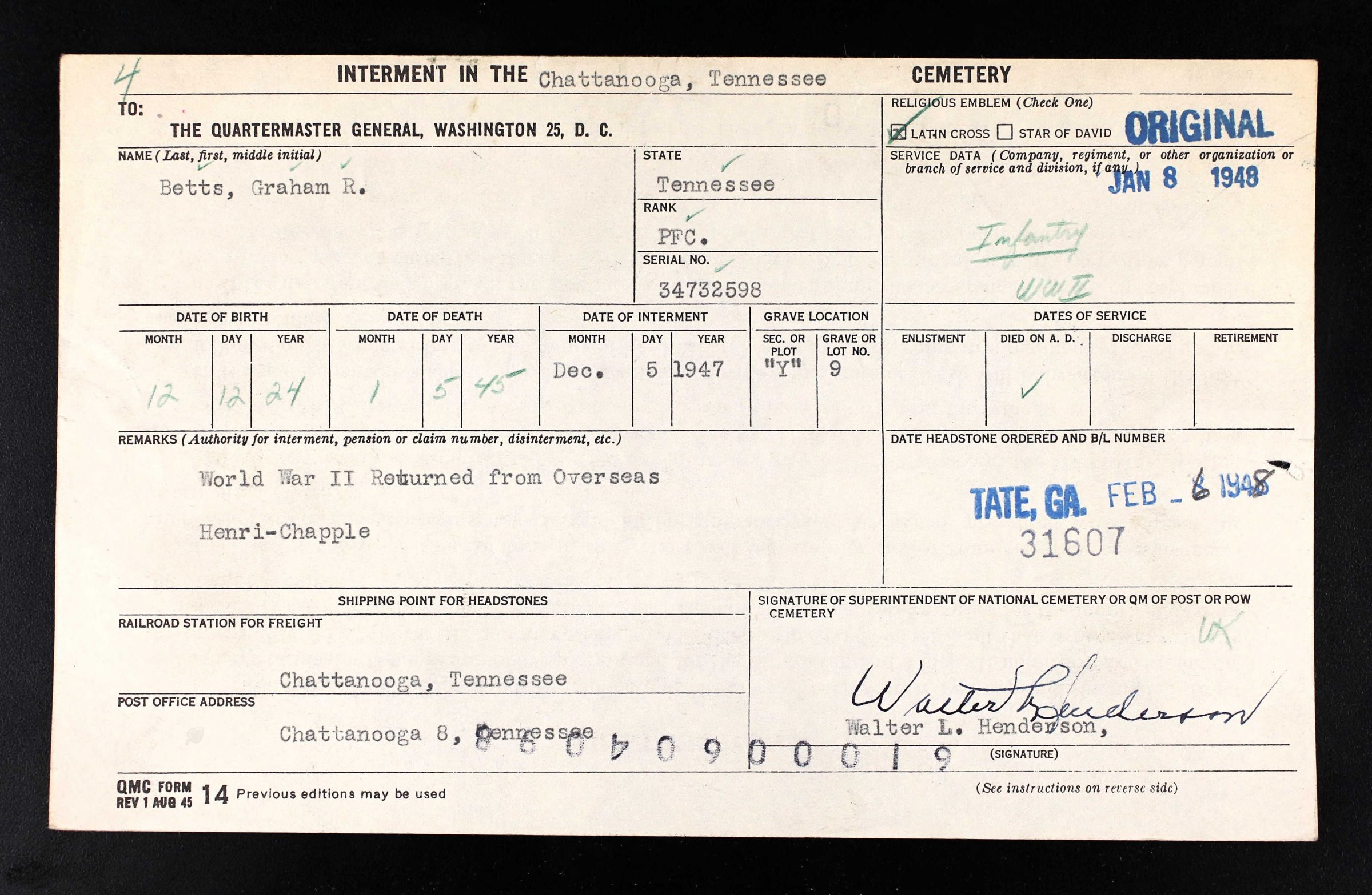 PFC Betts was initially buried at Henri-Chapelle American War Cemetery in Belgium.