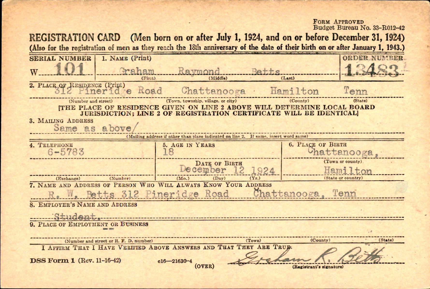 Graham Raymond Betts was born on 12 December 1924 at Chattanooga, Tennessee, the son of Russell Wood Betts and Mary Elizabeth McFarlane.