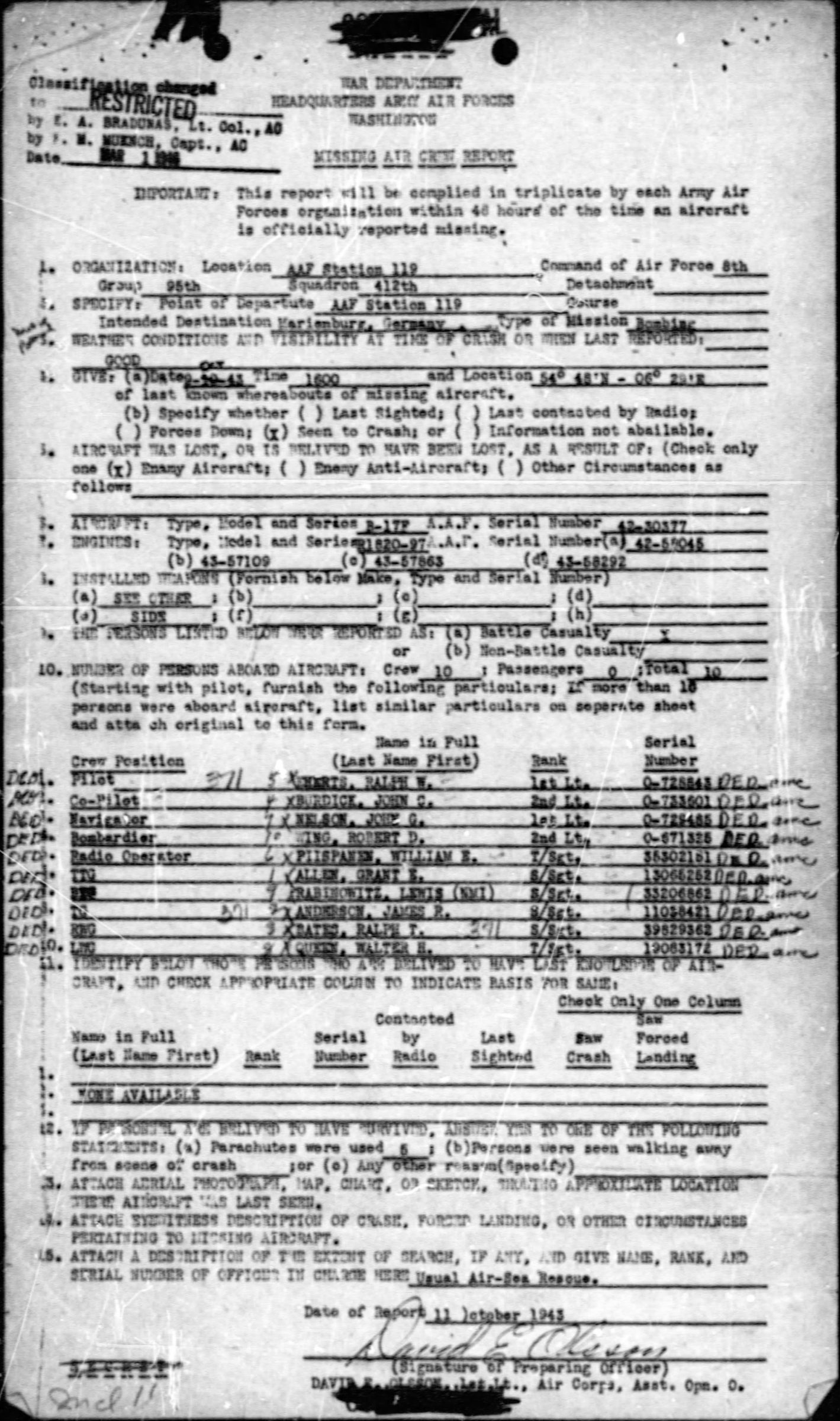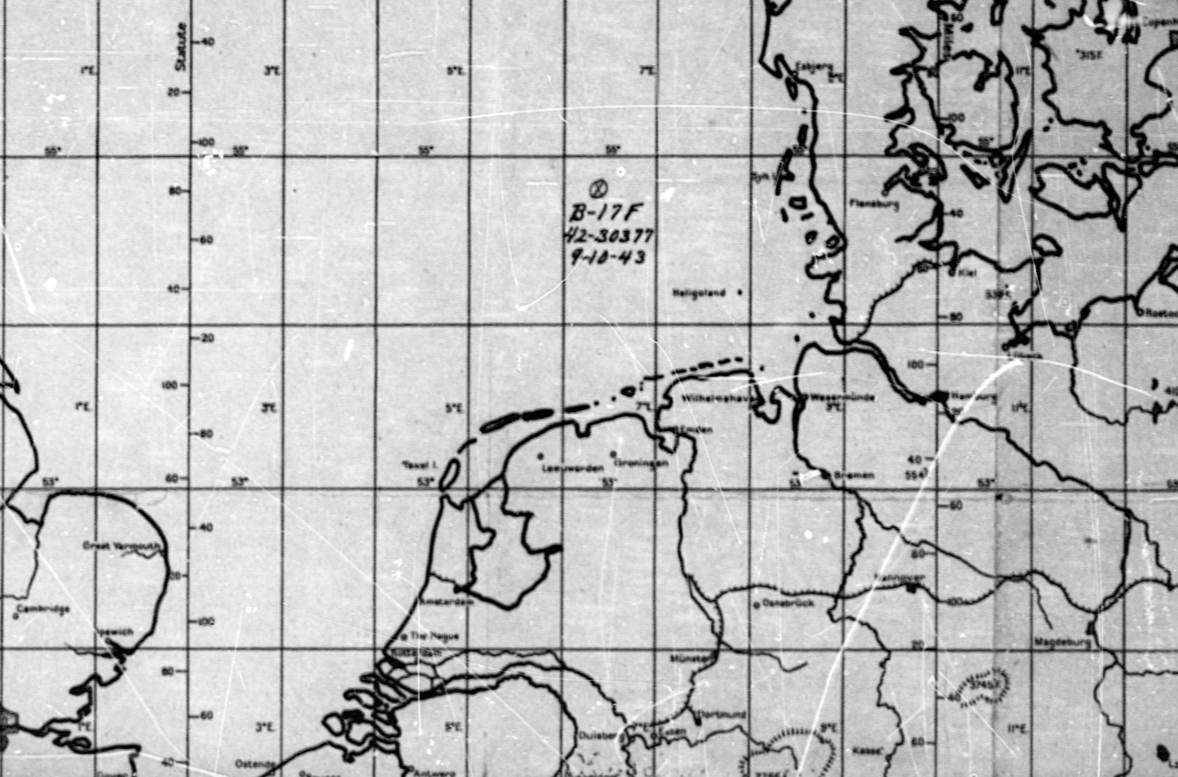 Aircraft B-17F with serial number 42-30377 was on a bombing mission to Marienburg, Germany. The aircraft was on the return trip from the target and last seen at 1600 at 5448N-0629E with number 2 engine afire caused by enemy fighters. Five chutes were seen leaving the ship before the aircraft exploded, broke up, and fell into the water. Estimated location of the crash northwest of Heligoland.