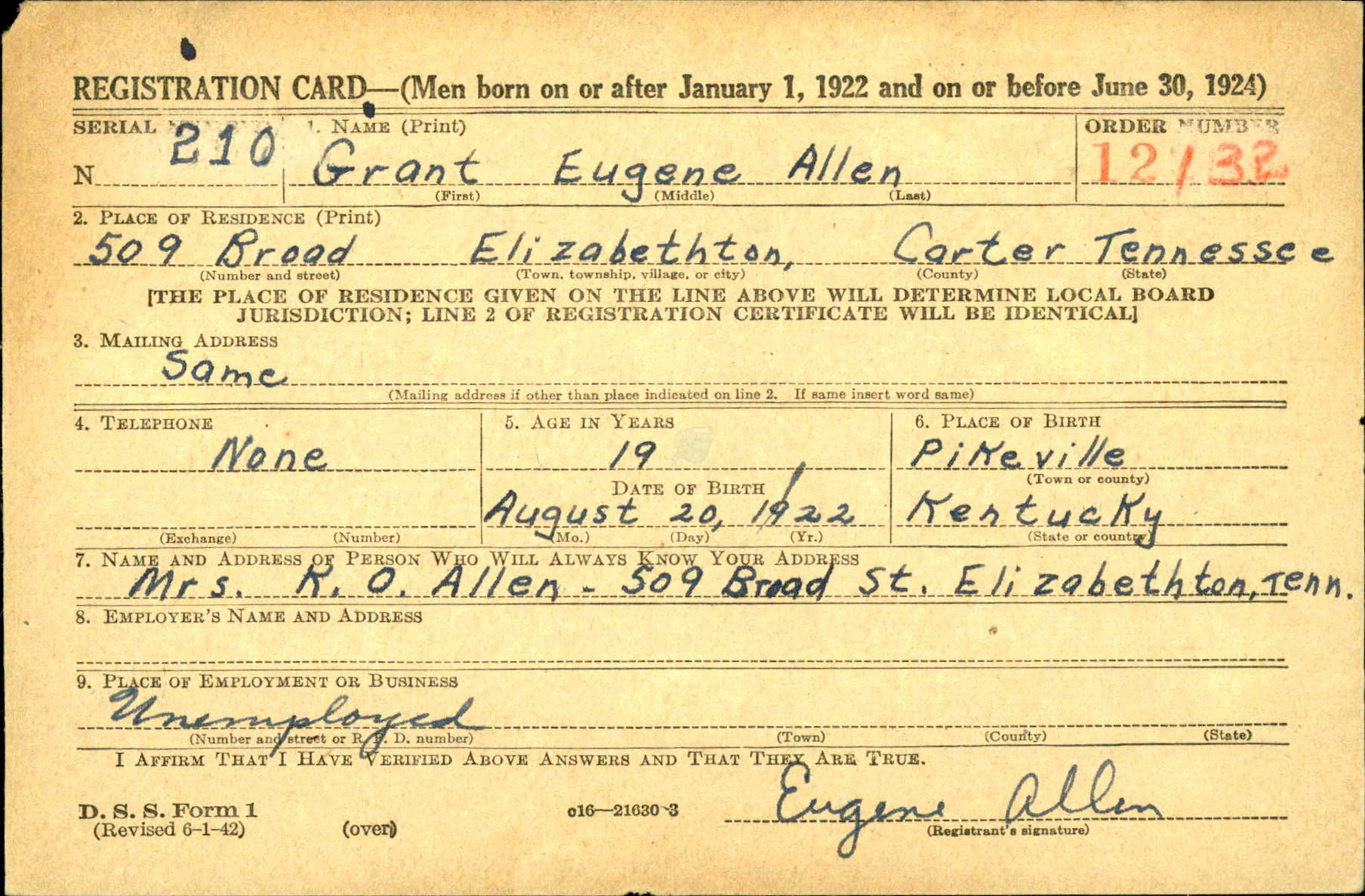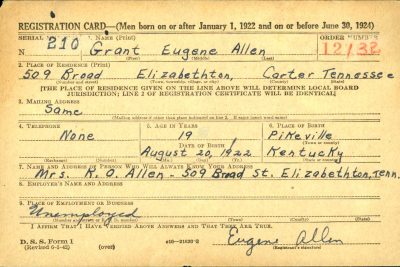 Grant Eugene Allen was born in Pikeville, Kentucky, the son of Kelley Orville Allen and Tressie Craft.