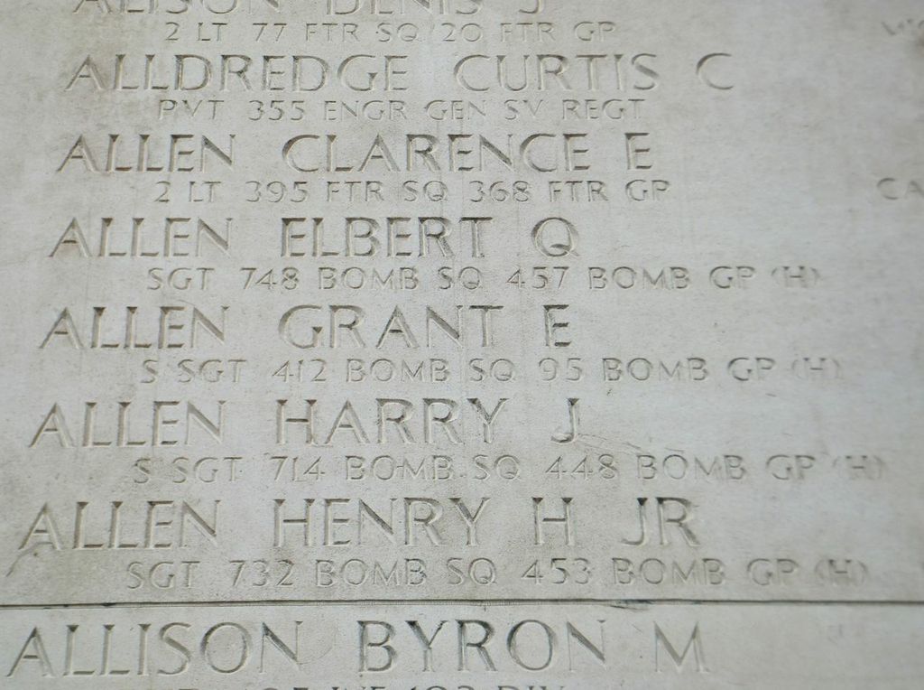 Staff Sergeant Grant E. Allen was assigned to the 412th Bomber Squadron, 95th Bomber Group H flying B-17 out of Horham, England. He died on 9 October 1943 and is listed on the Tablets of the Missing at the Netherlands American Cemetery, Margraten, Netherlands.