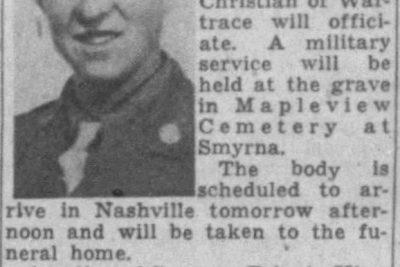 Funeral services for Pvt. Granville R. Kimbro, 19, who was killed in action in Northern France July 28, 1944, will be conducted at the Eastland Funeral Home. A military service will be held at the grave in Mapleview Cemetery at Smyrna. The body is scheduled to arrive in Nashville tomorrow afternoon and will be taken to the funeral home. A native of Smyrna, Private Kimbro was the son of Mr. and Mrs. Theodore R. Kimbro of near Antioch. He was a student at Antioch High School when he entered the service September 7, 1943. He received basic training at Camp Gruber, Okla., and went overseas in June, 1944. An infantryman, he was with the 42nd Rainbow Division. Private Kimbro was a member of the Mill Creek Baptist Church. In addition to his parents, he is survived by a sister, Miss Eddine Kimbro, and three brothers, John Howard, Daulton and Murray W. Kimbro, all of near Antioch.