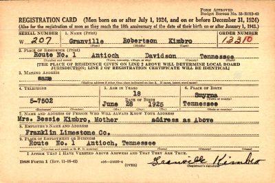 Granville Robertson Kimbro was born on 29 June 1925 at Smyrna, Tennessee, the son of Theodore Rosevelt Kimbro and Bessie Mae White,
