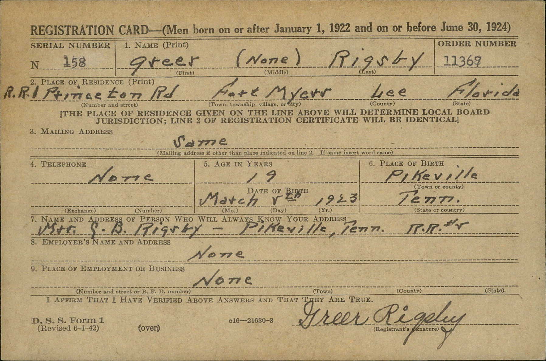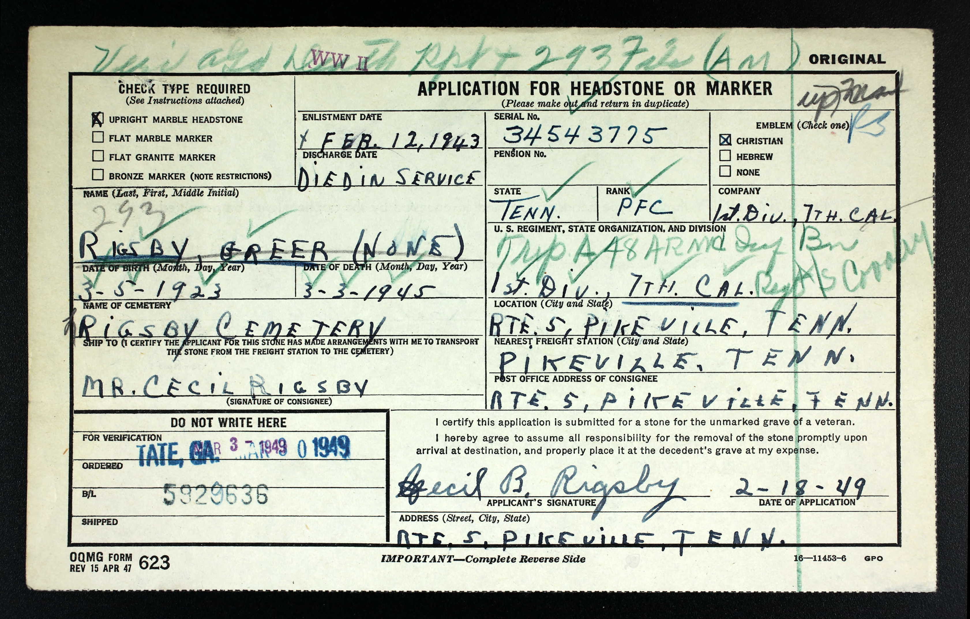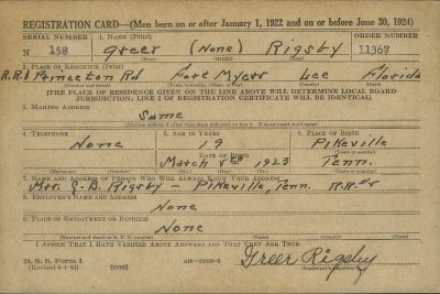 Greer Rigsby was born at Pikeville, Tennessee, the son of Cecil Bancroft Rigsby and Ida Jane Fann.