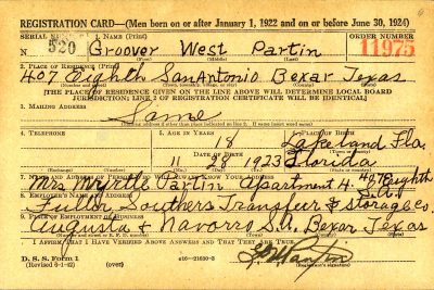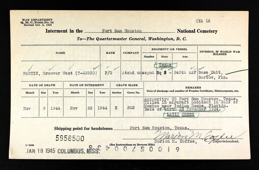 F/O Partin was stationed at Fort Sam Houston, Texas. He was killed in an aircraft accident in the Gulf of Mexico near Indian Rocks, Florida.