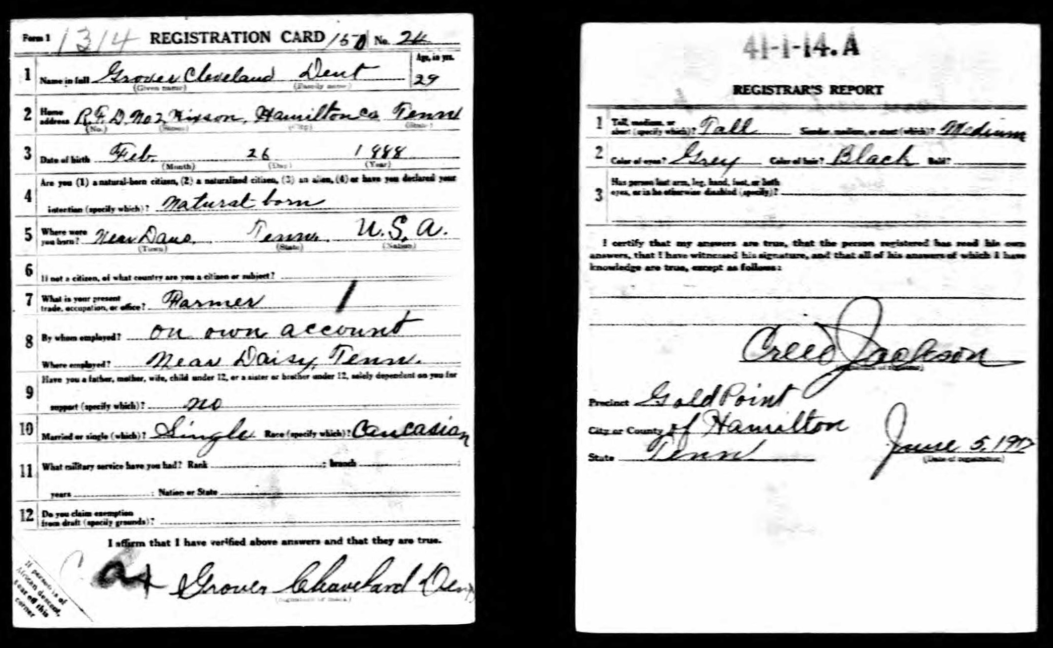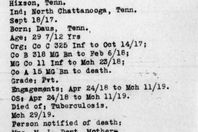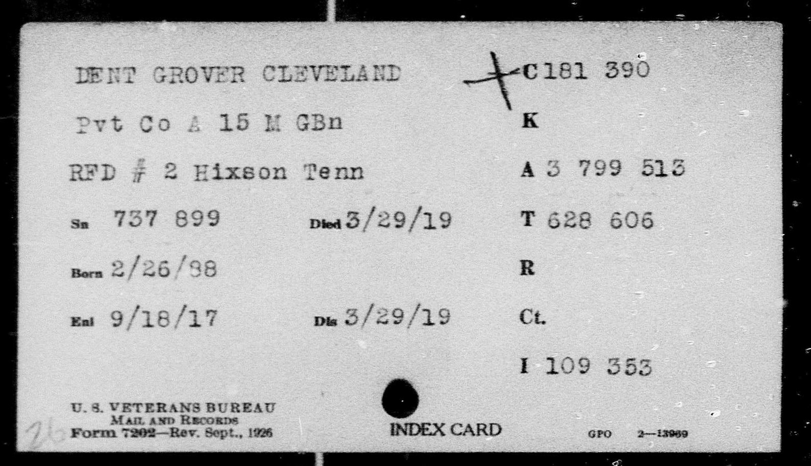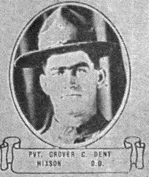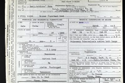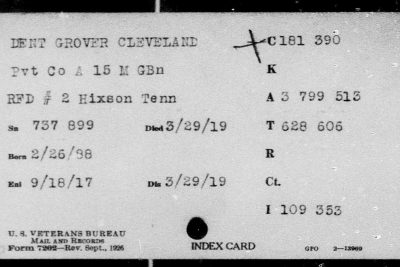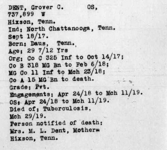 Grover Cleveland Dent was born 26th of February 1888 to Americus /Mericus “Lawson” Dent, and Adelia Louvern/Luvern Hoodenpyle of Hixson, Hamilton County, Tenn. He died of pulmonary tuberculosis active in both lungs at the Debarkation Hospital No. 51 at Elizabeth City in Virginia. He is buried at Ephraim Cemetery in Hixson, Tenn.