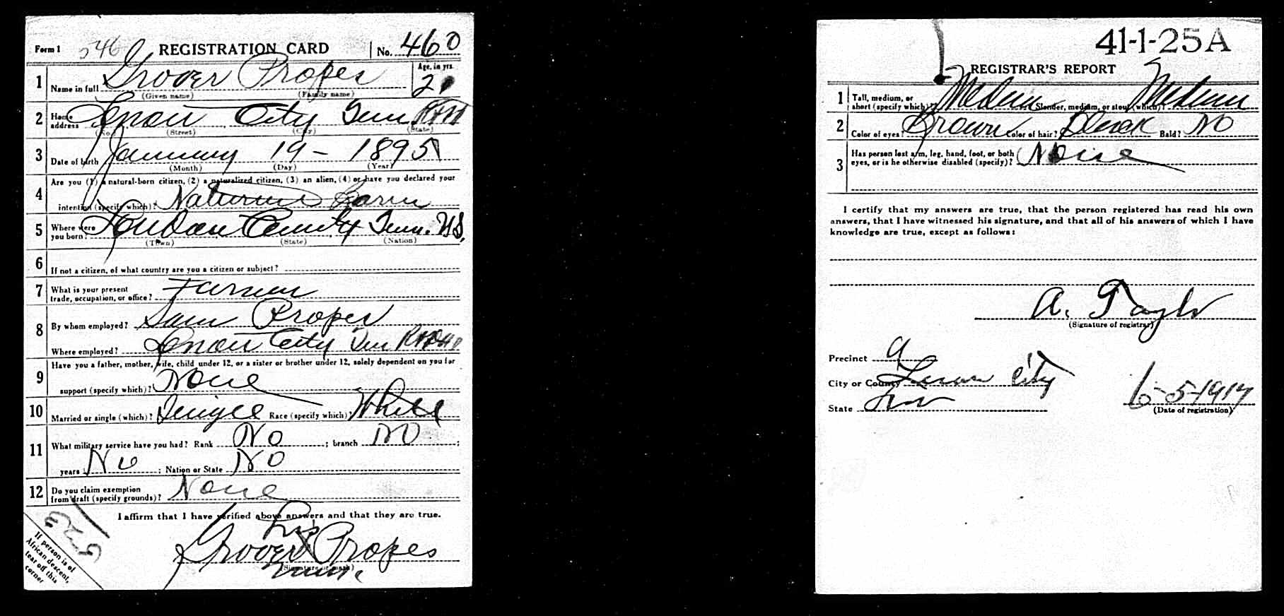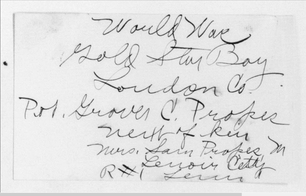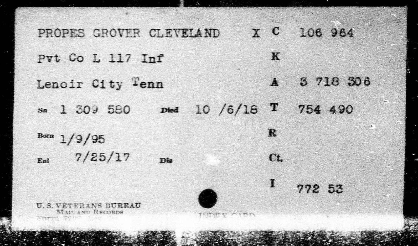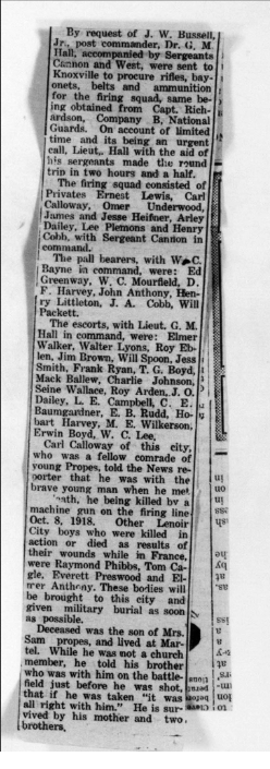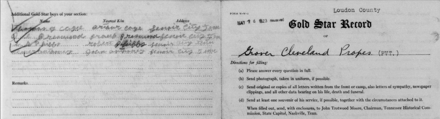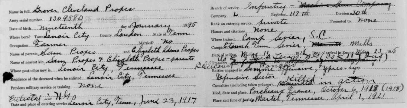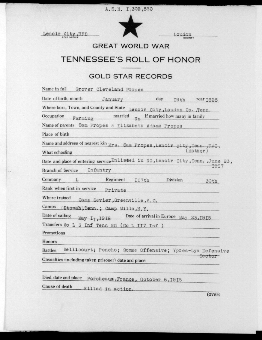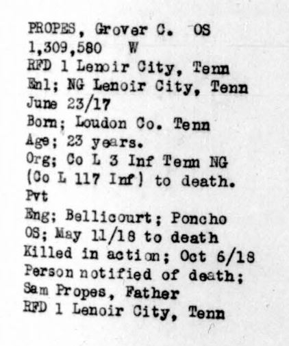 Grover Cleveland Propes was born in Lenoir City, Loudon County, TN to Sam Propes and Elizabeth Adams Propes. He was a farmer before he entered the service June 23, 1917. He trained at Camp Sevier in Greenville, South Carolina; Etowah, Tennessee and Camp Milla in New York. He sailed to Europe May 11, 1918 arriving on May 23. He served in Company L, 117th Infantry, 30th Division and was killed in action on October 6, 1918 at Porcheaux, France.