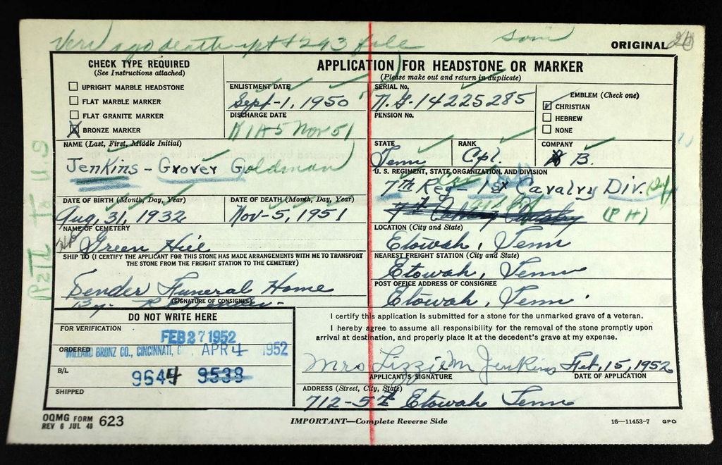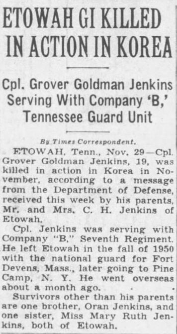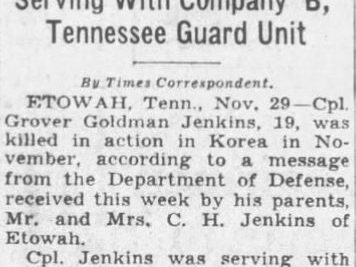 Capl. Grover Goldman Jenkins, 19, was killed in action in Korea in November, according to a message from the Department of Defense, received this week by his parents, Mr. and Mrs. C.H. Jenkins of Etowah. Cpl. Jenkins was serving with Company “B”, Seventh Regiment. He left Etowah in the fall of 1950 with the national guard for Fort Devens, Mass., later going to Pine Camp, N.Y. He went overseas about a month ago. Survivors other than his parents are one brother, Oran Jenkins, and one sister, Miss Mary Ruth Jenkins, both of Etowah.