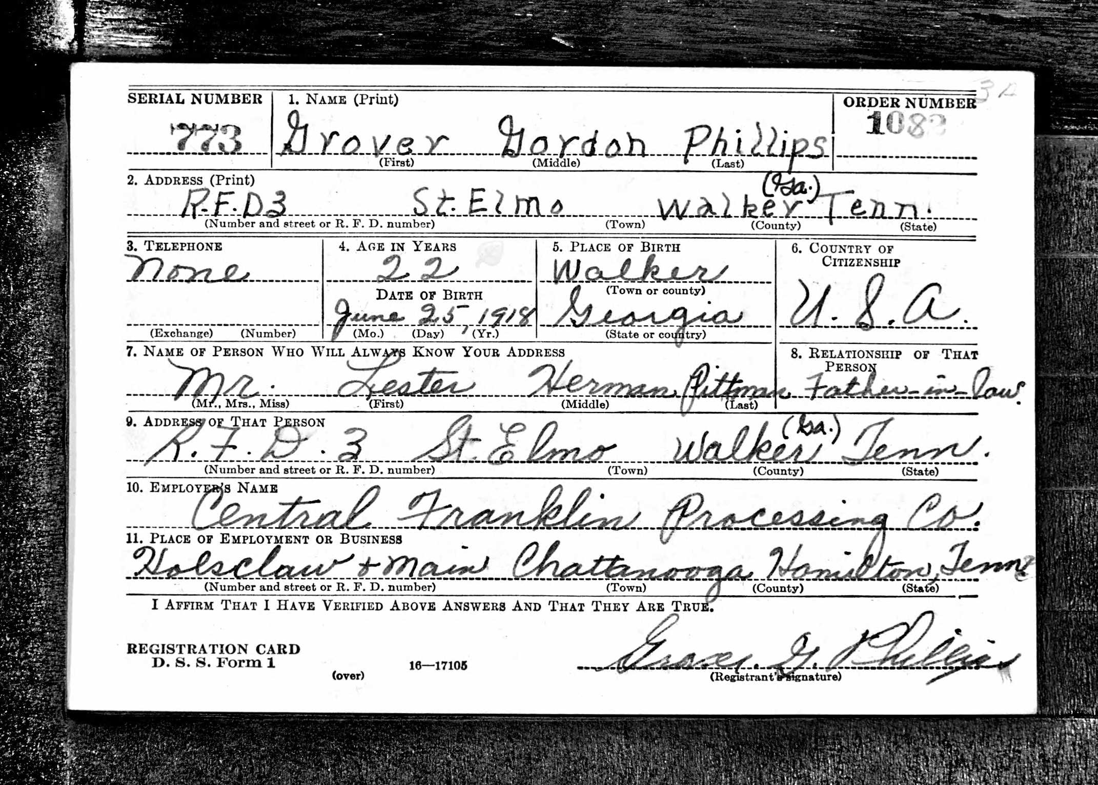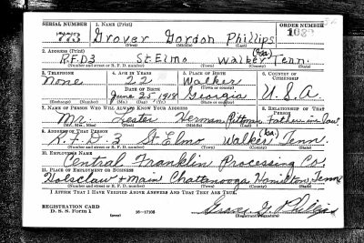 Grover Gordon Phillips was born at Walker, Georgia, the son of John White and Bertha Jane Russell. Husband of Daisy Aileen Pitman and father of Herman Floyd Phillips, John Franklin Phillips and James Gordon Phillips.