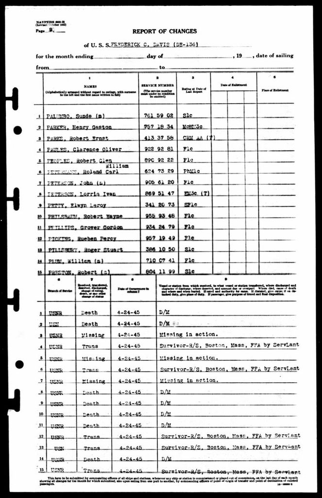 I found Mr. Phillips’ name in the Report of Changes for the ship. He reported to duty on the USS Frederick Davis on 11/3/44. He appears on the 6th in the attached report.